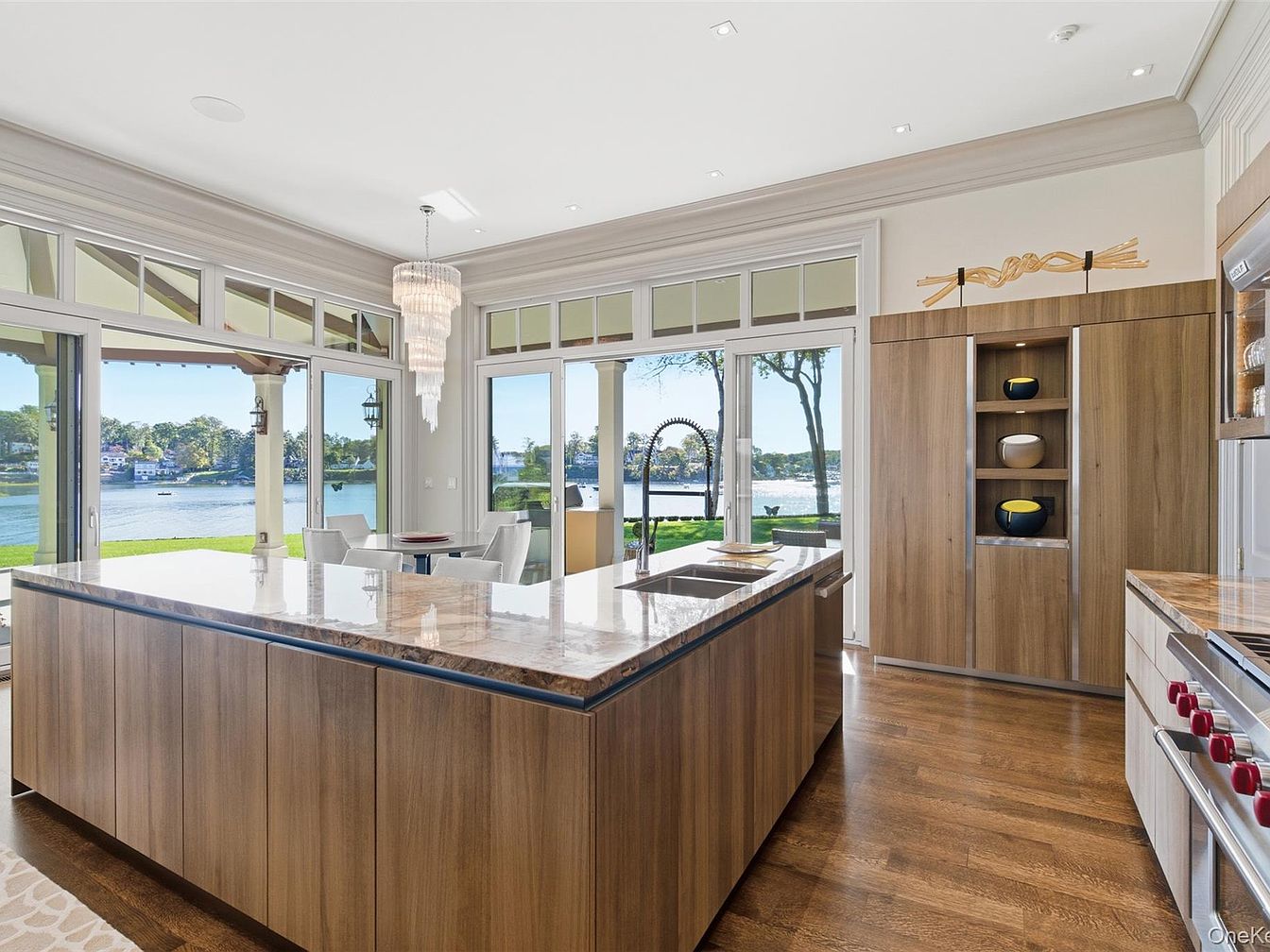 Sleek natural wood cabinetry and a luxurious marble-topped island set an inviting tone in this open-concept kitchen, where soft neutral tones create a serene, family-friendly environment. Expansive windows and doors bathe the space in natural light and offer seamless access to the outdoor patio, perfectly framing a tranquil lake view. Modern appliances and a deep sink integrate practicality with style, while a stunning tiered chandelier adds elegance above the built-in dining nook. Clever storage, including open display shelves, keeps the area organized and accessible, making this kitchen ideal for family gatherings or casual entertaining.