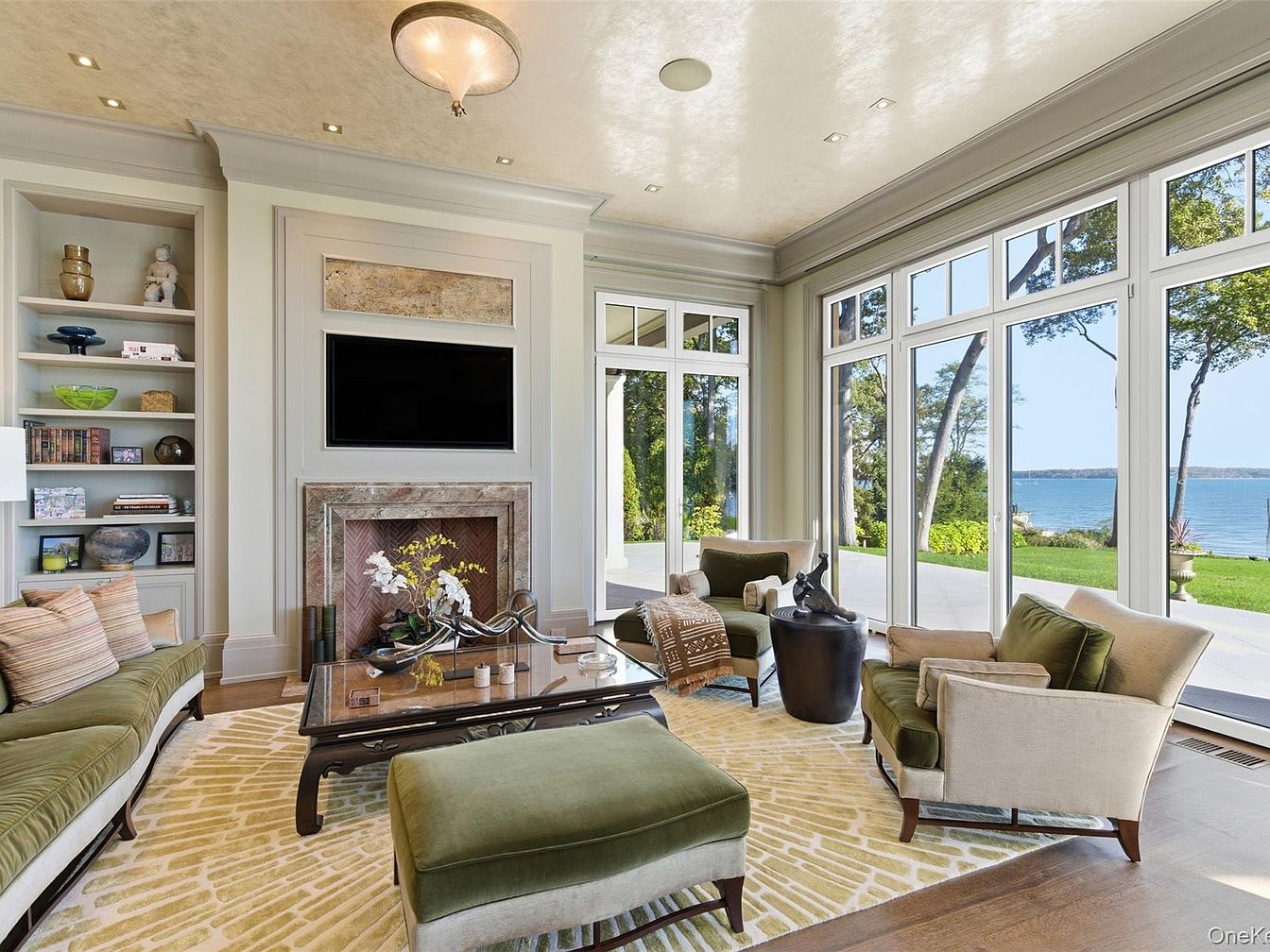 Expansive windows allow natural light to flood the living room while offering a stunning panoramic view of the waterfront. Soft, neutral wall tones pair with light wood flooring for a tranquil atmosphere, complemented by sage green and beige upholstered furniture. The room features a stylish fireplace framed by built-in shelving displaying family photos and decorative pieces, adding a personal touch. A large area rug grounds the seating area, which is perfect for family gatherings or entertaining. Generous seating invites relaxation, and the open layout seamlessly connects the interior to a spacious patio and lush outdoor space.