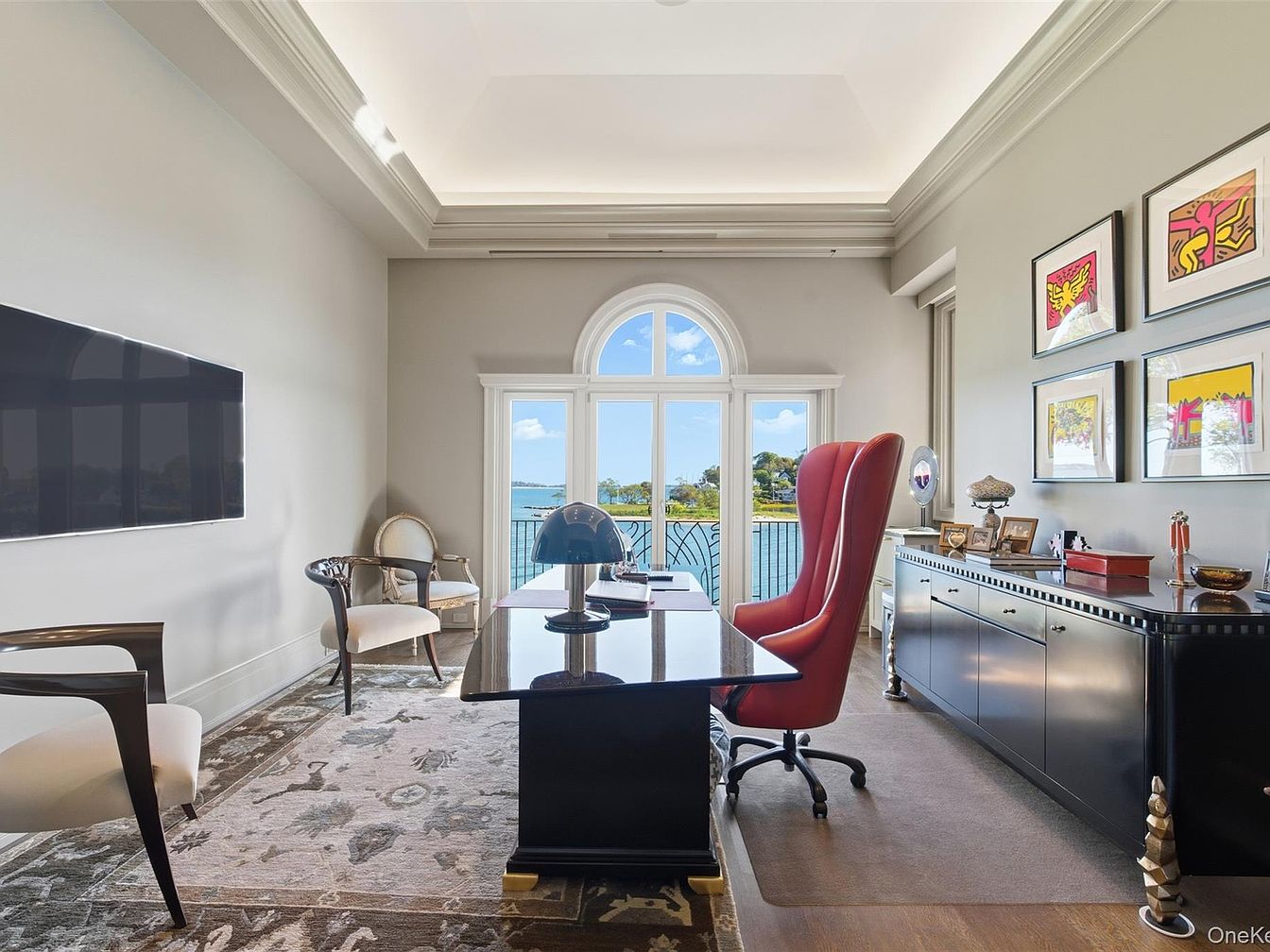 This sophisticated home office offers plenty of natural light from a large arched window overlooking a picturesque lake. The high coffered ceiling and neutral wall tones create a refined and open atmosphere, while the plush patterned area rug adds warmth underfoot. A dramatic red wingback desk chair stands as the focal point, complemented by sleek modern side chairs and a substantial wooden desk. The streamlined black credenza displays family photos and vibrant pop art, infusing the space with personality. Comfortable furnishings and a serene view make this a productive and welcoming workspace, perfect for both focus and family moments.