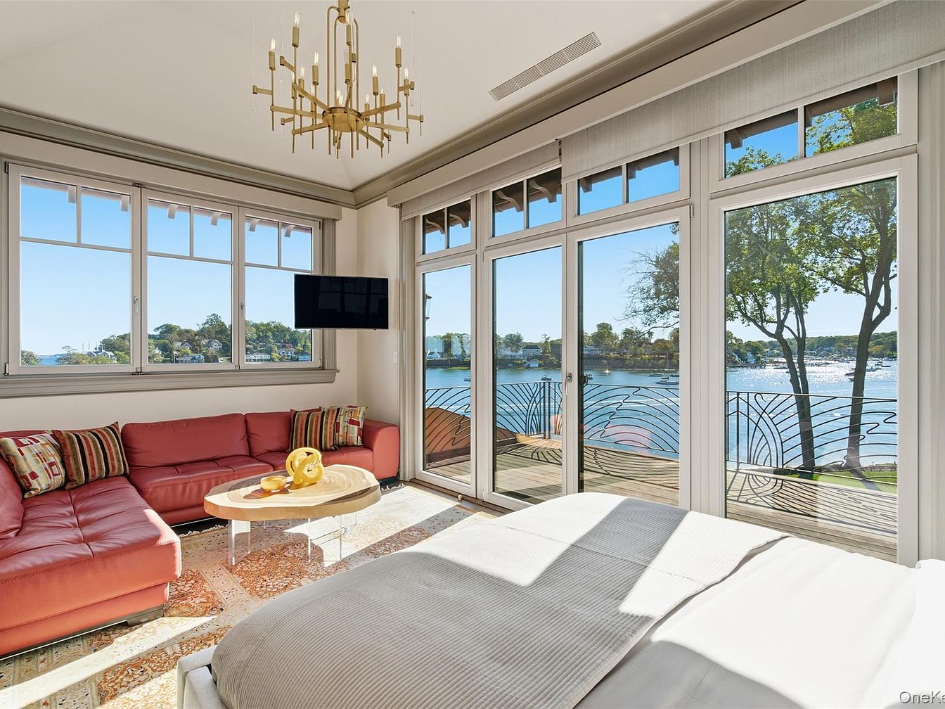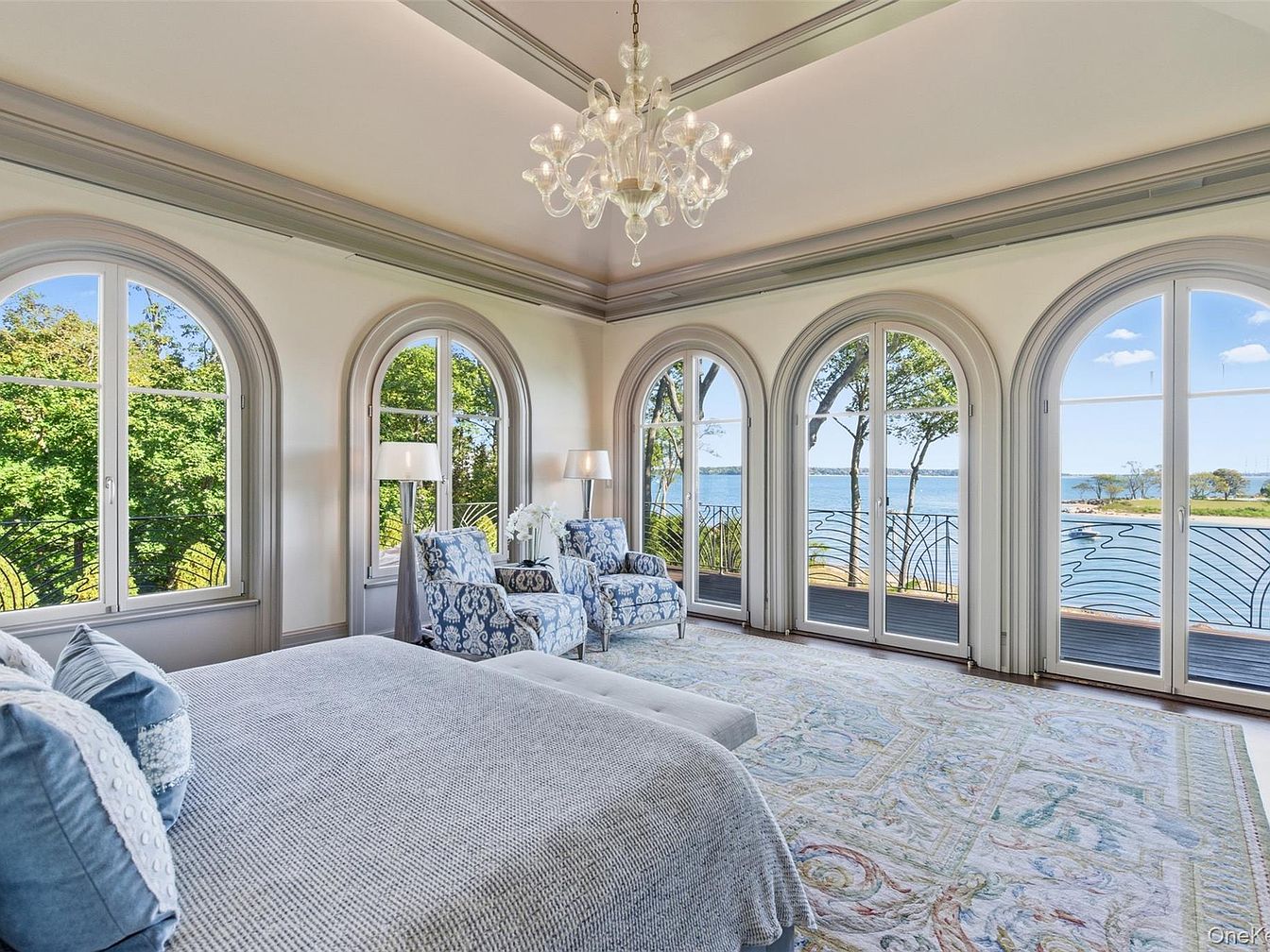 Expansive arched windows fill this master bedroom with natural light and frame a breathtaking waterfront view, creating a serene and elegant retreat. The room features a soft palette of tranquil blue and cream hues, complemented by plush bedding and coordinating pillows. Two patterned, upholstered armchairs provide a cozy sitting area near the windows, perfect for relaxing while taking in the scenic landscape. A luxurious chandelier adds a touch of sophistication, while the intricate area rug underfoot enhances warmth and comfort for family living. High ceilings with detailed molding elevate the space’s airy and refined atmosphere, ideal for restful moments.