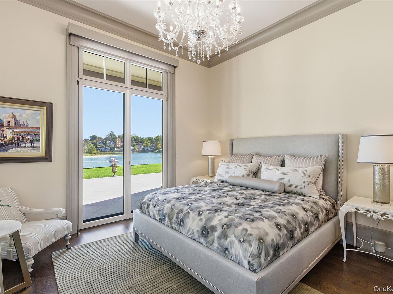 A spacious and serene master bedroom features an inviting king-sized bed with a plush, patterned comforter and an array of decorative pillows, creating a cozy environment perfect for relaxation. The room is bathed in natural light thanks to large glass doors that open to a patio overlooking a picturesque waterfront view, seamlessly blending indoor and outdoor living. Subtle neutral tones dominate the color scheme, complementing the soft grey upholstered bed and matching furniture. Family-friendly details include wide pathways, minimal clutter, and elegant table lamps for ambient lighting, all set beneath an exquisite crystal chandelier that adds a touch of luxury.