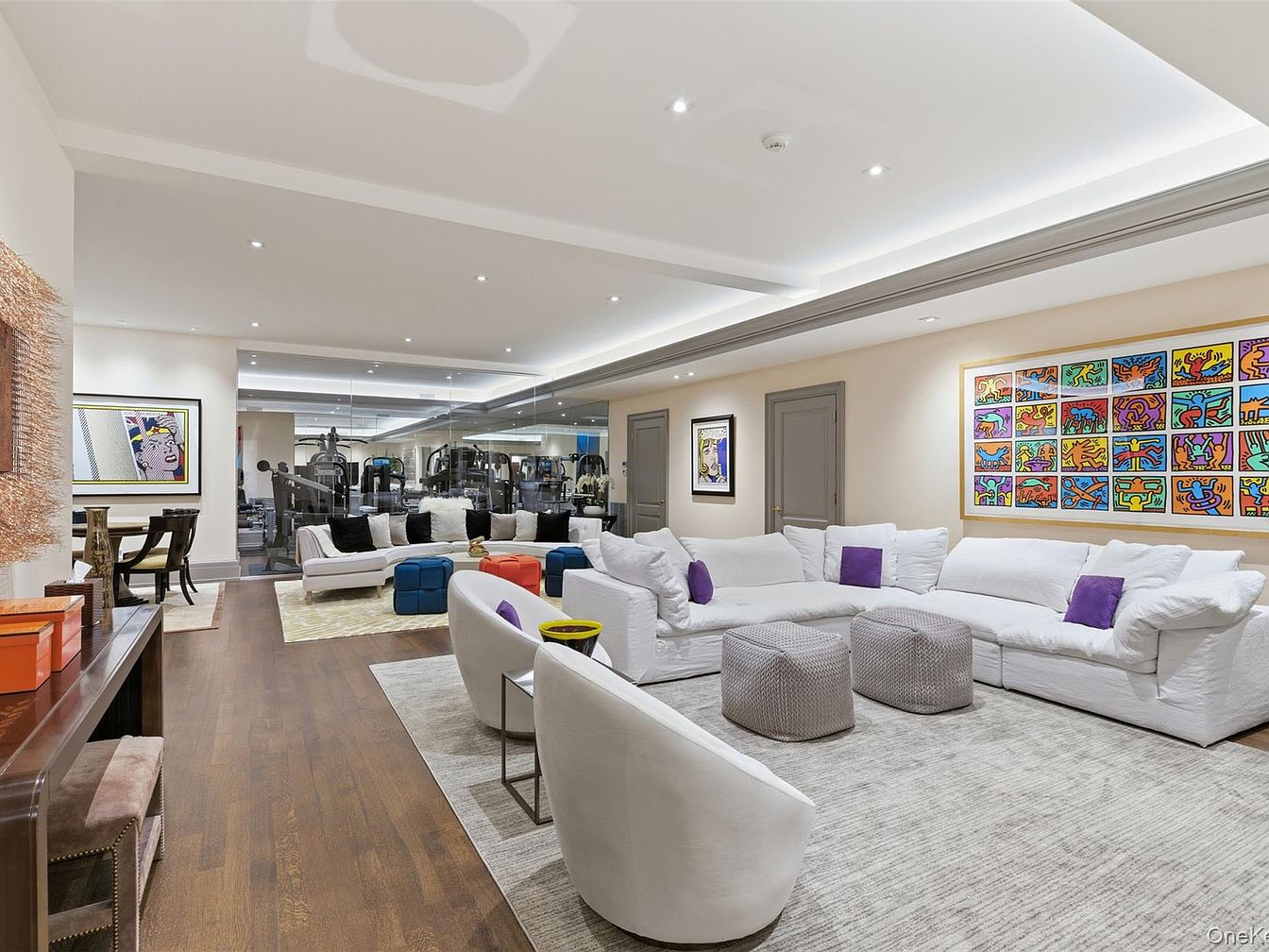 An expansive open-concept family room invites relaxation and socialization with a large, modular white sectional sofa set against neutral walls. Pops of color from playful artwork and accent pillows in purple add vibrancy and modern energy. The room is designed to cater to both adults and kids, with ottomans and moveable cube seats offering flexibility for gatherings or playtime. A plush area rug softens the hardwood floors, while recessed lighting and subtle ceiling coves provide a warm, inviting ambiance. An adjacent mirrored wall enhances the sense of space and connects the area to a visible home gym, ensuring functionality and family wellness.