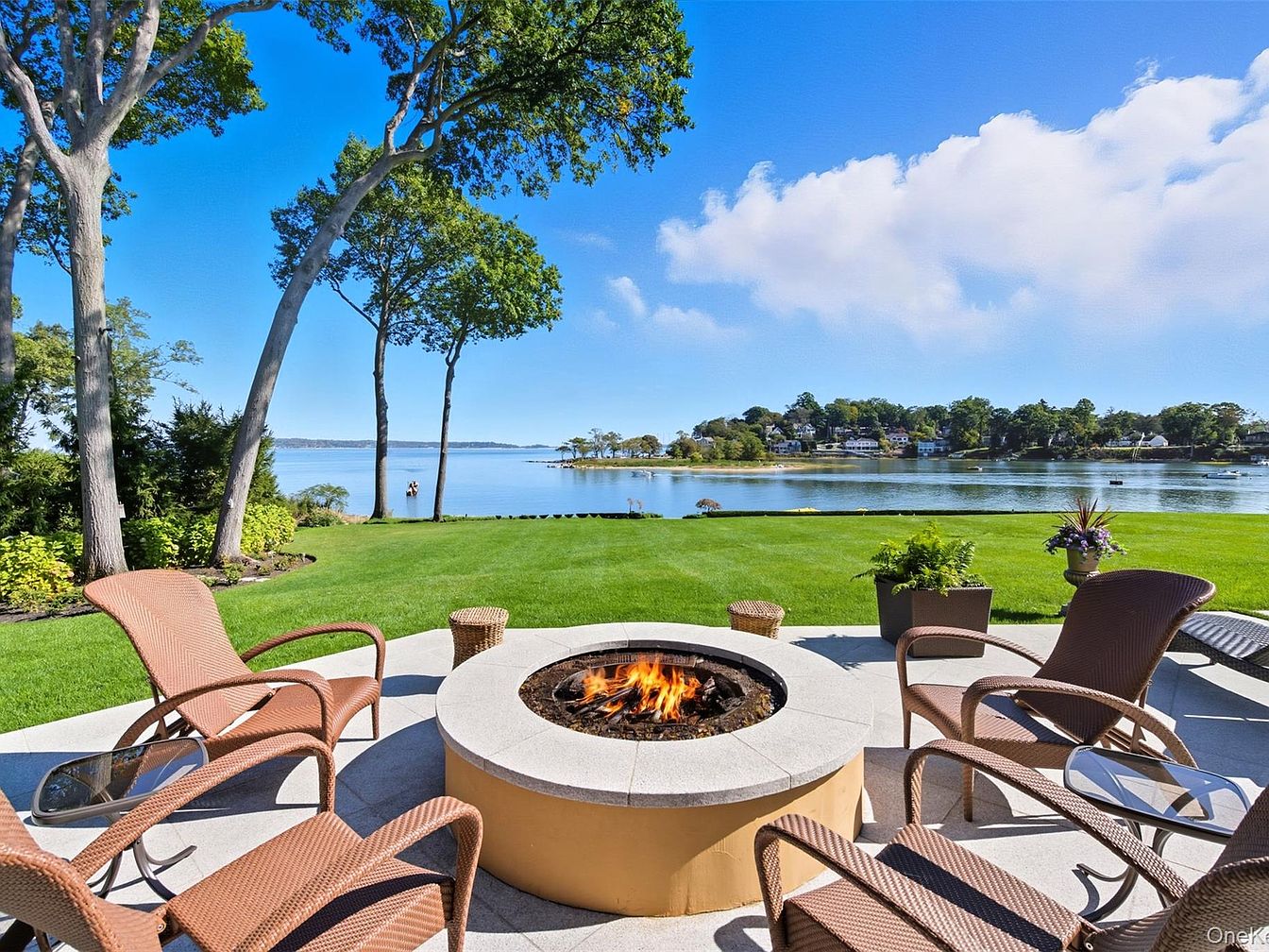 This serene outdoor patio offers the perfect blend of comfort and scenery, featuring a cozy fire pit surrounded by six comfortable, woven armchairs. The circular arrangement encourages conversation and togetherness, ideal for family gatherings or entertaining friends. The patio’s bright stone flooring contrasts beautifully with the lush, meticulously maintained lawn that gently rolls toward a scenic lake, providing tranquil water views and a sense of openness. Potted plants and tasteful landscaping soften the hardscape, adding natural color and life. An inviting space where both children and adults can relax, play, and savor the outdoors in style.