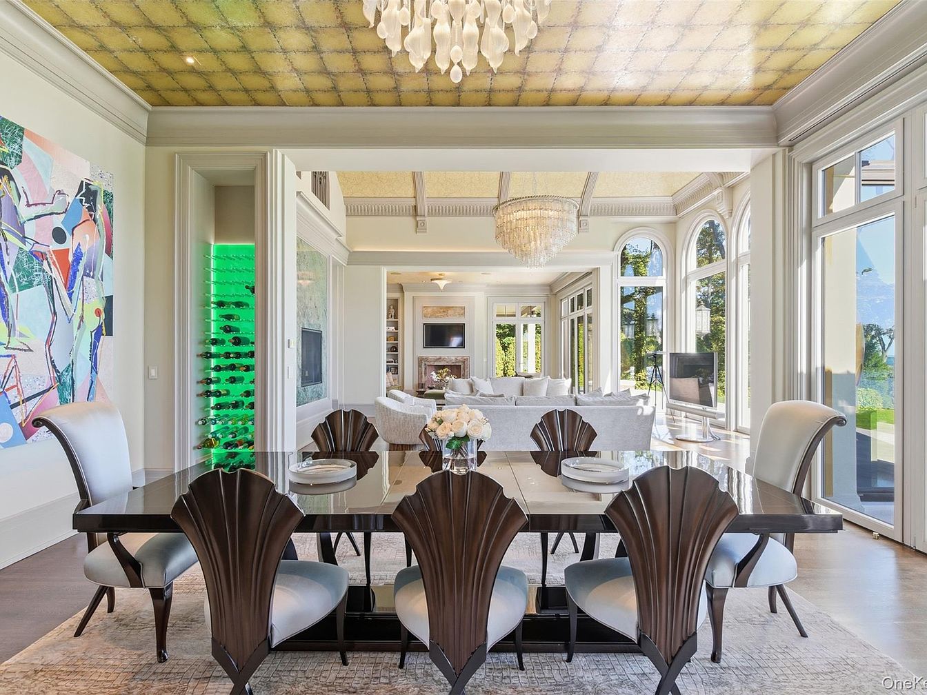 An elegant open-concept dining and living space blends sophistication with warmth, ideal for gatherings both formal and casual. The dining area features a bold glass-topped table surrounded by sleek, shell-inspired chairs, set atop a muted area rug. A modern wine display softly glows with green accent lighting, adding a luxurious detail. Spaciousness continues into the living area, with plush white sofas arranged for conversation and movies, embraced by tall, arched windows that flood the space with natural light. An abstract wall mural, striking chandeliers, and a patterned gold ceiling offer artistic touches, while comfortable seating and ample room ensure it’s family friendly.