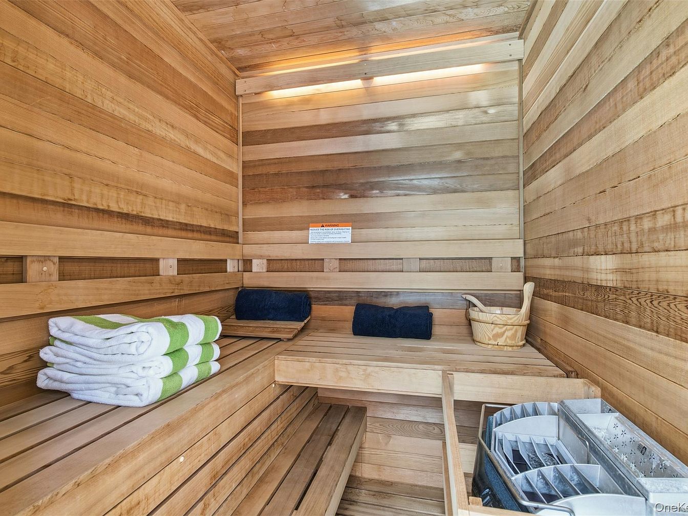 Warmth and relaxation envelop this beautifully crafted sauna, featuring smooth horizontal cedar planks that create a cozy, inviting ambiance. The tiered bench layout maximizes comfort and versatility for family members of all ages, while the gentle overhead lighting adds a tranquil touch to the space. Essential sauna accessories, such as a traditional wooden bucket and ladle, neatly rolled towels, and well-placed stones for steaming, enhance the experience. The use of natural wood tones throughout bestows a modern yet timeless aesthetic, making it a perfect spot for unwinding and promoting wellness right in your own home.