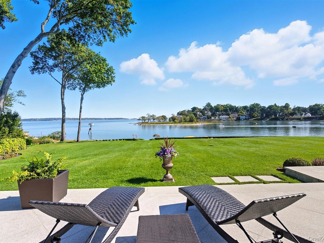 This serene patio overlooks a manicured green lawn that gently slopes toward a sparkling lake, framed by mature trees for natural shade. Two modern rattan lounge chairs invite relaxation and offer a perfect spot for enjoying the panoramic water views. Planters with vibrant greenery and a decorative urn filled with flowers enhance the inviting, family-friendly atmosphere. The spacious open design allows ample room for kids to play safely or for hosting gatherings. Neutral tones in the outdoor furnishings complement the lush landscape, while the stone patio elevates the space’s timeless, resort-like appeal. Perfect for tranquil mornings or sunset evenings with loved ones.