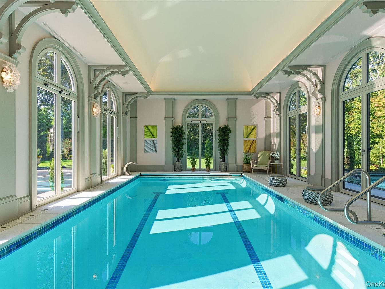 Flooded with natural light from a series of tall arched windows, this indoor pool area radiates elegance and tranquility. Soft shades of gray and white envelop the space, while intricate ceiling moldings and sconces add architectural charm. Comfortable seating and lush potted plants at the end of the pool create a welcoming spot for families to relax and socialize. Artful green and yellow wall accents bring subtle vibrancy, complimenting the verdant views just beyond the glass. The pool’s length allows for exercise and play, and the easy access to the outdoors makes this a family-friendly oasis perfect for year-round enjoyment.