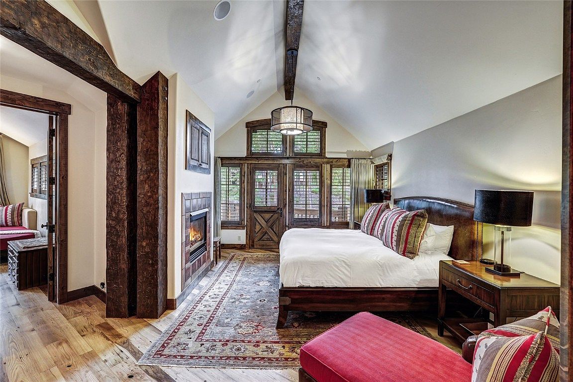 A spacious, serene master bedroom blends rustic charm with elegant comfort. The vaulted ceiling with dark wood beams creates openness, while wide-plank wood floors and barn-style doors add character. Large windows with wooden shutters allow natural light and privacy. The bed is dressed in fresh white linens and topped with inviting striped pillows, complemented by a vibrant red chaise and cozy rug. A modern fireplace provides warmth, making this space family-friendly and perfect for relaxation. Subtle lamps and neutral walls complete the calming color palette, creating a welcoming atmosphere that balances sophistication with mountain lodge appeal.