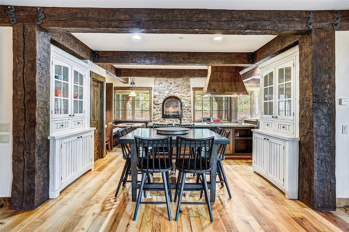 This inviting kitchen and dining area radiates rustic charm with its exposed dark wood beams and light knotty wood flooring, offering a welcoming space perfect for family gatherings. The central dining table features black spindle-back chairs, providing ample seating for both everyday meals and lively holiday dinners. Built-in white cabinetry adds a touch of farmhouse elegance alongside abundant storage for dishware and kitchen essentials. Natural light pours in through large windows, illuminating the stone feature wall with a built-in fireplace, creating a cozy focal point. The room’s spacious layout encourages togetherness, making it ideal for family-friendly living.