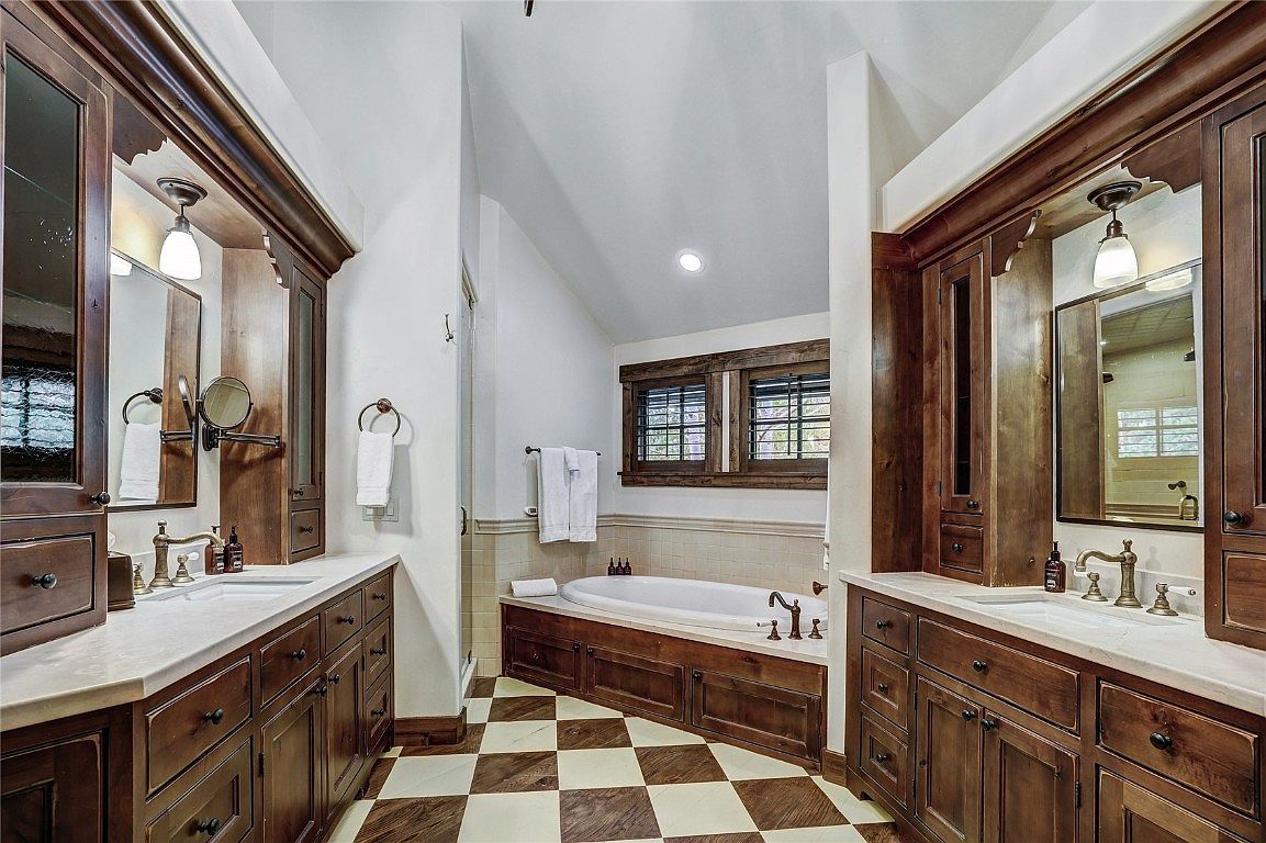 A spacious master bathroom showcases elegant symmetry with dual vanities and warm wood cabinetry, offering abundant storage for families. The centerpiece is a generously sized soaking tub framed by classic wood panels beneath a window with wooden shutters, providing privacy and natural light. The checkerboard patterned tile floor in contrasting tones adds charm and visual interest. Soft, creamy walls enhance the airy feel created by high, vaulted ceilings. Practical touches like double sinks and multiple towel racks accommodate busy mornings. The overall atmosphere blends functionality with traditional style, achieving a cozy yet upscale sanctuary perfect for relaxation and daily routines.