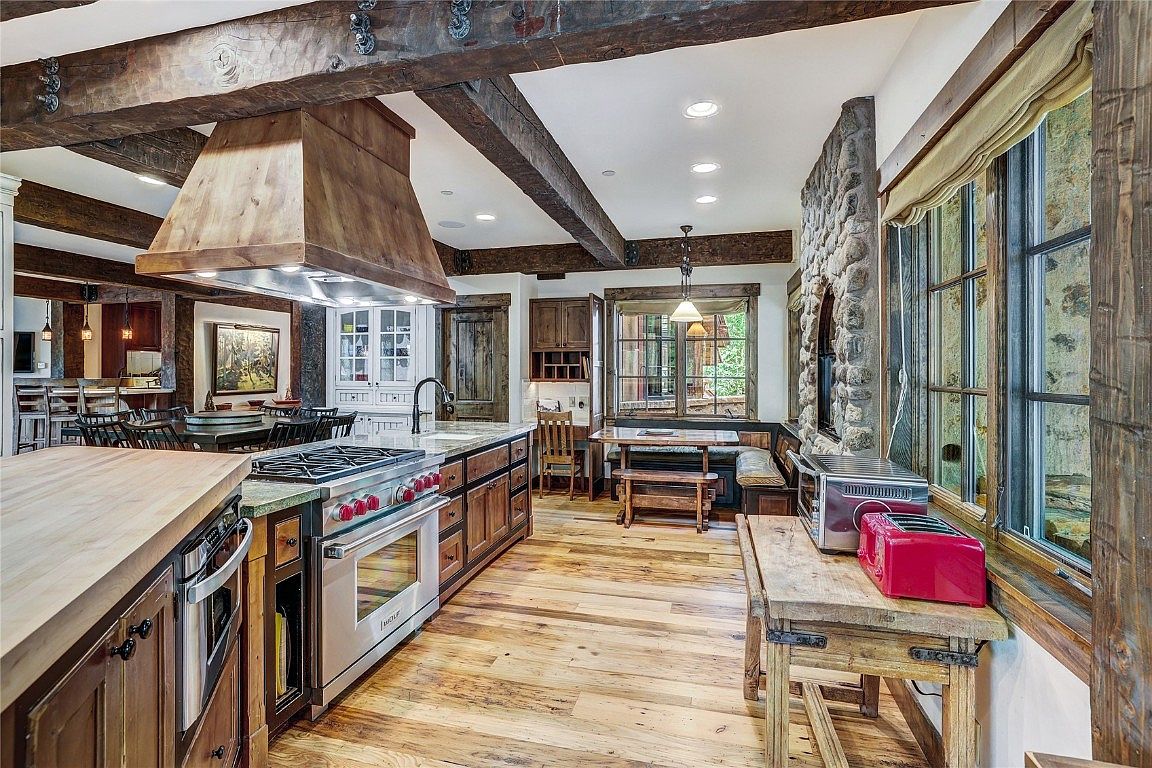 Warmth and character define this open-concept kitchen and breakfast nook, where rough-hewn wood beams, stone accents, and wide-plank hardwood floors create a cozy, inviting ambiance. The kitchen features a large central island with butcher block and granite countertops, a professional range, and custom cabinetry in natural finishes. An adjacent breakfast nook offers a built-in bench and farmhouse table, perfect for family meals or game nights. Multiple windows fill the space with natural light and showcase the scenic outdoors, while the seating areas are thoughtfully arranged to foster connection, comfort, and functionality for busy family life.