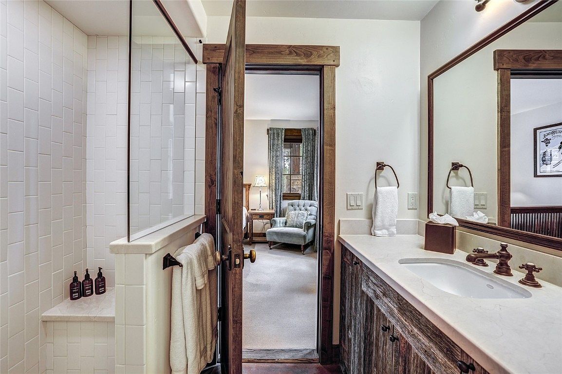 This bathroom features a rustic yet refined aesthetic, combining natural wood accents with modern fixtures. A spacious vanity with a natural wood base and sleek, stone countertop provides ample storage and space for family use. The large mirror framed in matching wood enhances the brightness of the room, while dual towel rings and elegant bronze fixtures add subtle sophistication. The walk-in shower is clad in crisp white subway tiles and includes a built-in bench, perfect for young children or older family members. The open doorway reveals a cozy adjoining bedroom, enhancing the space’s inviting, family-friendly feel.