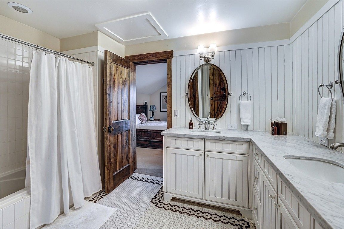 Bright, airy, and inviting, this bathroom showcases a family-friendly double vanity with a marble countertop, perfect for busy mornings. The white shiplap walls add rustic charm, while warm wood accents, seen in the paneled door and oval mirror frame, bring a cozy, homely feel. Soft, hexagonal tile flooring bordered with dark tiles creates understated pattern and elegance. Ample cabinetry ensures organized storage for toiletries and linens. Chrome fixtures, wall-mounted sconces, and fluffy hand towels enhance the comfortable ambiance. The bathtub with a curtain offers child-friendly convenience, and the direct entry from a bedroom boosts both functionality and flow for family living.