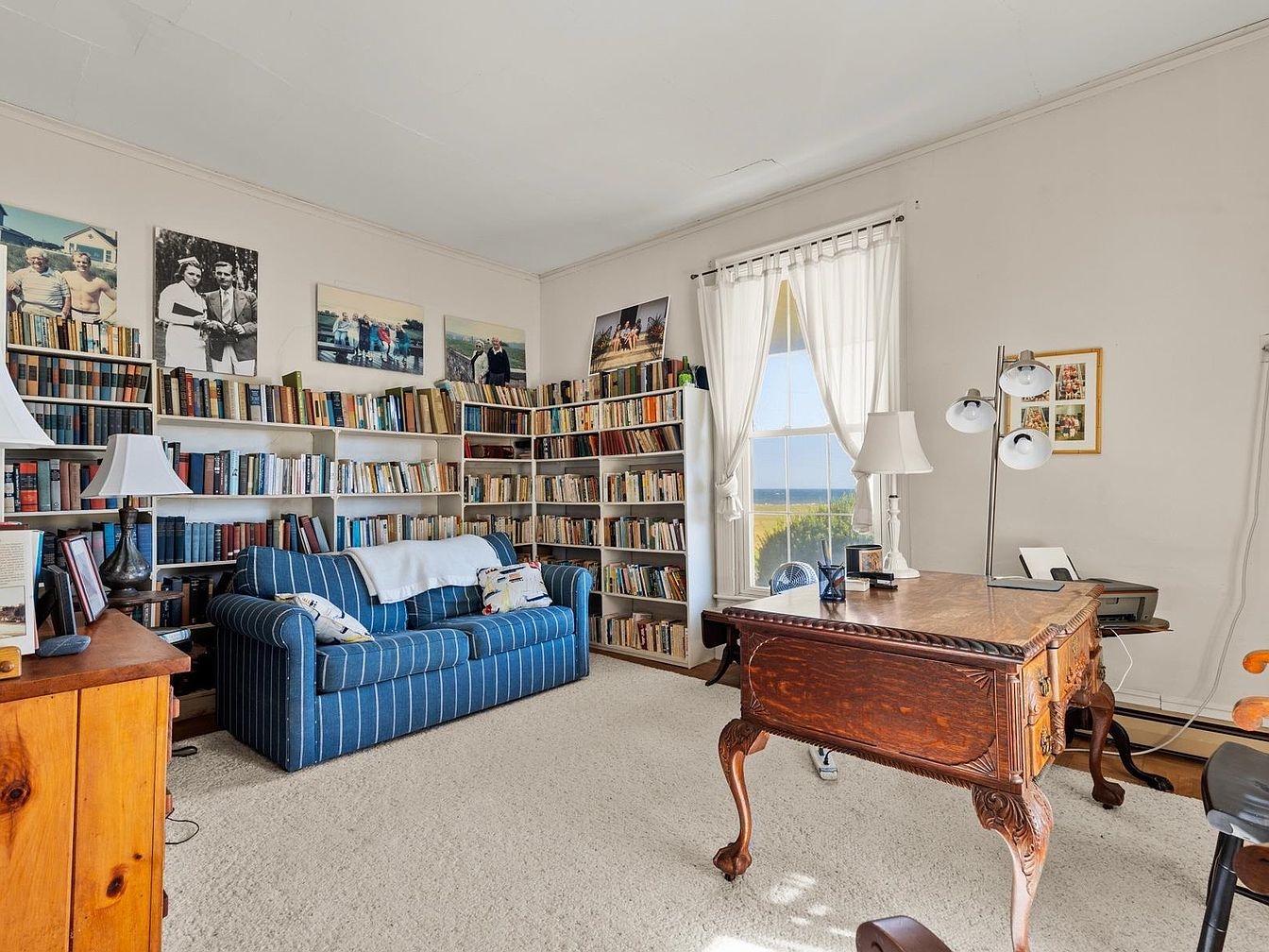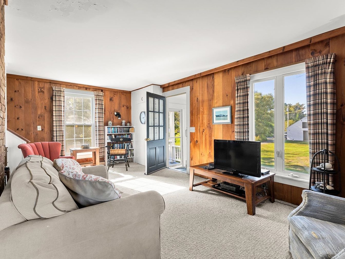 Warmth and coziness define this family room, where rich wood-paneled walls and large windows with plaid curtains create a classic, inviting atmosphere. The layout encourages relaxation and connection, with a comfortable beige sofa and matching armchair positioned for conversation or TV viewing. Natural light floods the space, highlighting thoughtful details like a small library nook with bookshelves and a writing desk, perfect for both adults and children. The doorway leads to a bright hallway, seamlessly integrating indoor and outdoor living. Neutral carpeting and wood furnishings add durability and comfort, ideal for a family-centered lifestyle.
