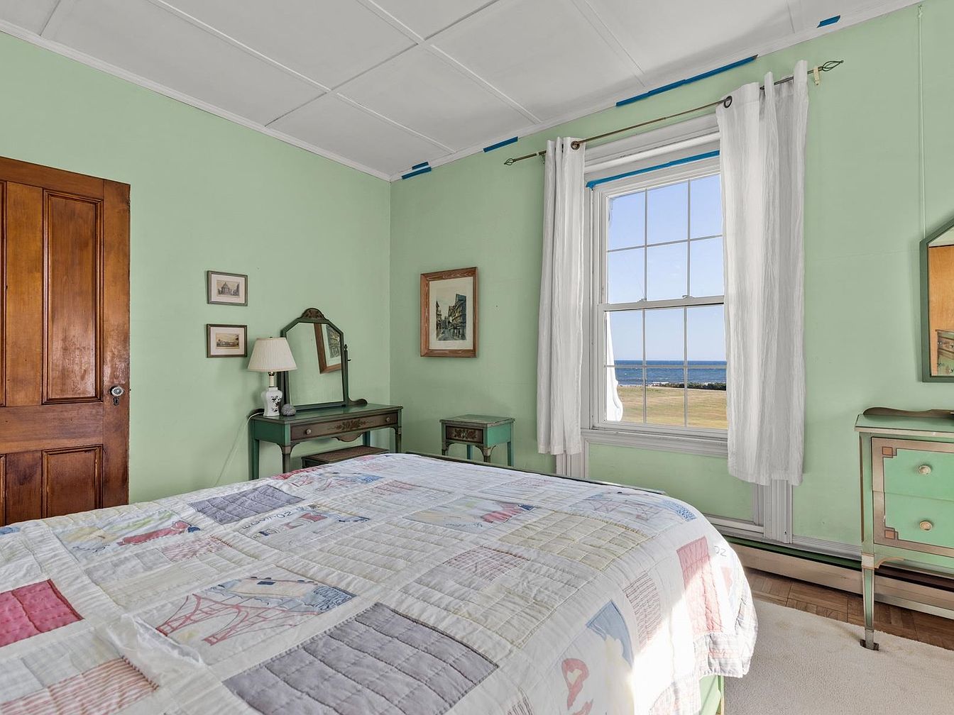 A serene bedroom filled with soft, pastel green walls and classic white paneled ceiling creates a calming atmosphere. The centerpiece, a bed dressed in a cheerful patchwork quilt, adds a charming, family-friendly touch. Natural wood doors and vintage-style painted furniture bring warmth and personality, while the large window frames a breathtaking ocean view, flooding the room with sunlight. White curtains add a breezy feel, and the room’s layout provides ample space for children or guests. Gentle, traditional decor pieces and delicate artwork complete the inviting ambiance, making it a restful retreat for the whole family.