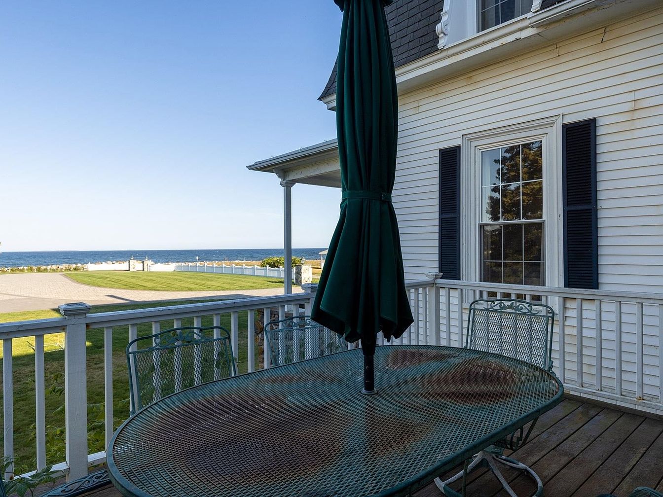 This inviting patio provides a tranquil spot to enjoy ocean views and fresh sea air, connecting effortlessly with the spacious yard and the charming white-fenced perimeter. An elegant wrought-iron table and chairs offer ample seating for family gatherings or al fresco meals, shaded by a large green umbrella. The classic white siding of the home, contrasted by black shutters and ornate exterior trim, adds timeless character. The wood decking underfoot gives a natural, relaxed feel, making the space both stylish and family-friendly, perfect for kids to play nearby while adults unwind in comfort amidst coastal surroundings.