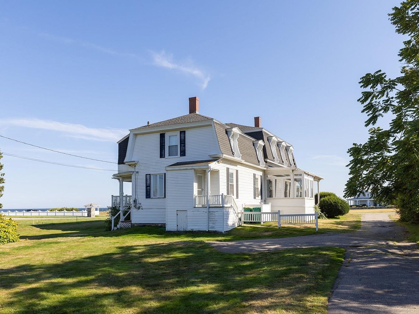 A charming American home features classic white clapboard siding and a gambrel roof, evoking a timeless New England vibe. The welcoming wraparound porch and fenced-in entryway provide a spacious, family-friendly setting, ideal for social gatherings or children’s play. Large windows flood the interior with light while offering panoramic outdoor views. The manicured front lawn delivers plenty of space for outdoor activities, while shade trees and mature shrubbery add natural beauty and privacy. Architectural details such as dormer windows and twin chimneys elevate its historic charm, making this house perfect for those dreaming of a serene family haven near the water.