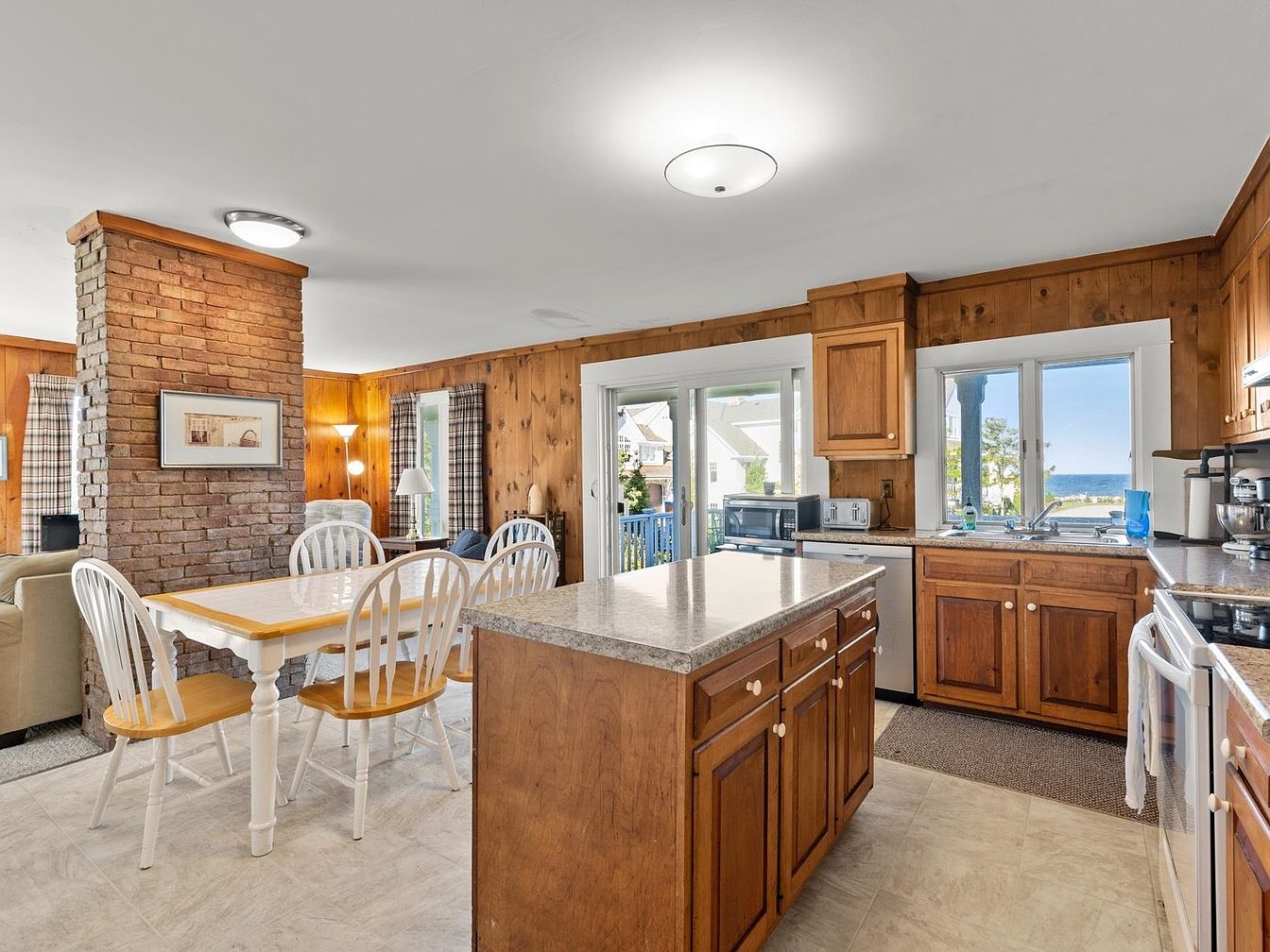 A spacious open-concept kitchen and dining area features warm wood cabinetry, granite countertops, and inviting panelled walls that radiate rustic charm. The island provides ample workspace for meal prep while the adjacent dining table, paired with classic white wooden chairs, accommodates family gatherings. Large windows and glass doors flood the space with natural light and offer a picturesque view of the backyard and water beyond. The brick pillar adds texture and character, seamlessly dividing the kitchen from a cozy living area. Durable tiled flooring and easy-to-clean surfaces make this space ideal for busy families and entertaining guests.