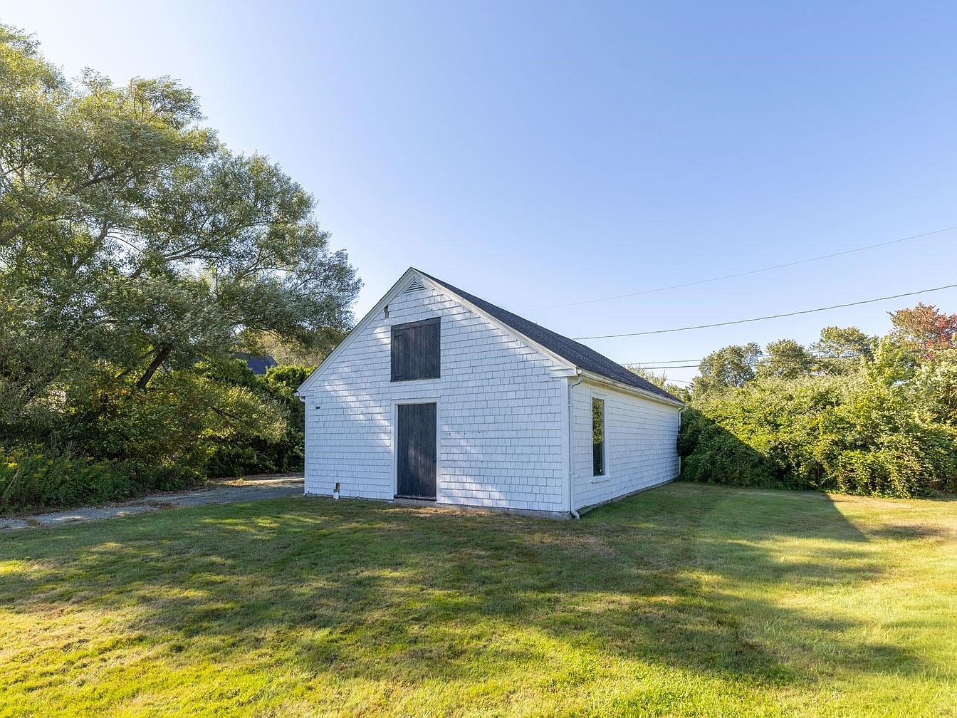 A charming detached outbuilding sits in the center of a spacious backyard, surrounded by mature trees and well-maintained grass. The structure features classic white shingle siding, simple geometric lines, and a dark gabled roof, creating a timeless New England cottage aesthetic. Its utilitarian design offers versatility for use as a workshop, playhouse, or extra storage, making it family friendly. The broad lawn provides plenty of space for children to play, garden parties, or outdoor activities. The peaceful, private setting emphasizes tranquility and connection to nature, ideal for a relaxed family lifestyle or creative outdoor pursuits.