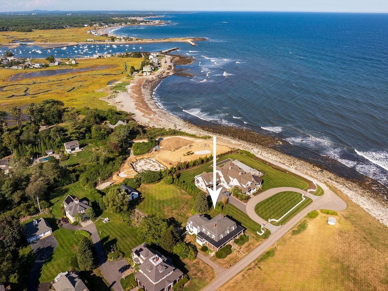 Sweeping aerial view of an inviting oceanfront property with manicured lawns and private coastal access. The home sits prominently near the water, offering wide open vistas of the ocean and surrounding marshland, creating a tranquil setting ideal for families. Expansive green spaces around the home are perfect for outdoor play, gatherings, or relaxing by the shore. The property is dotted with established landscaping while neighboring homes feature similar charming aesthetics, creating a harmonious coastal community. Gently curving driveways, classic architectural lines, and spacious surroundings embody New England seaside living, making this setting both picturesque and welcoming for all ages.