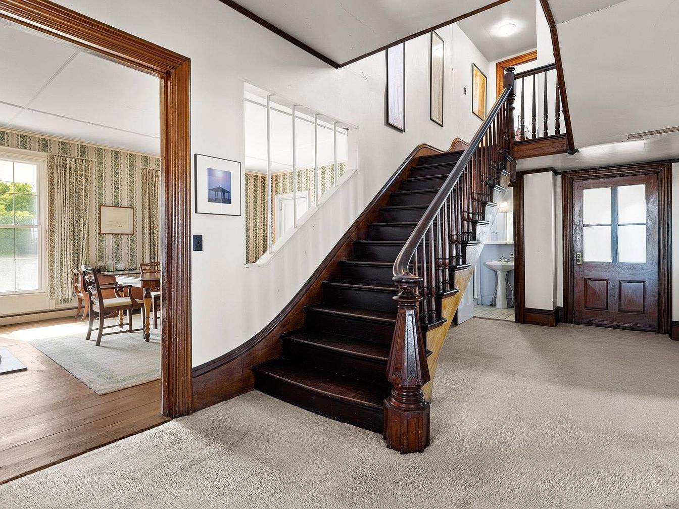 This welcoming entryway features a striking dark wood staircase with classic balusters and rounded newel posts, providing a timeless focal point for the home. Light neutral carpeting complements the crisp white walls, enhancing the feeling of space and cleanliness. Natural light pours in from adjacent rooms, including a formal dining area with vintage wallpaper and elegant furniture, highlighting family-friendly, open sightlines. The entryway offers convenient access to a powder room and showcases deep-stained wood trim around doors and stairwell, balancing traditional charm with modern touches. Spacious and uncluttered, this entry sets a gracious tone for family gatherings and everyday living.