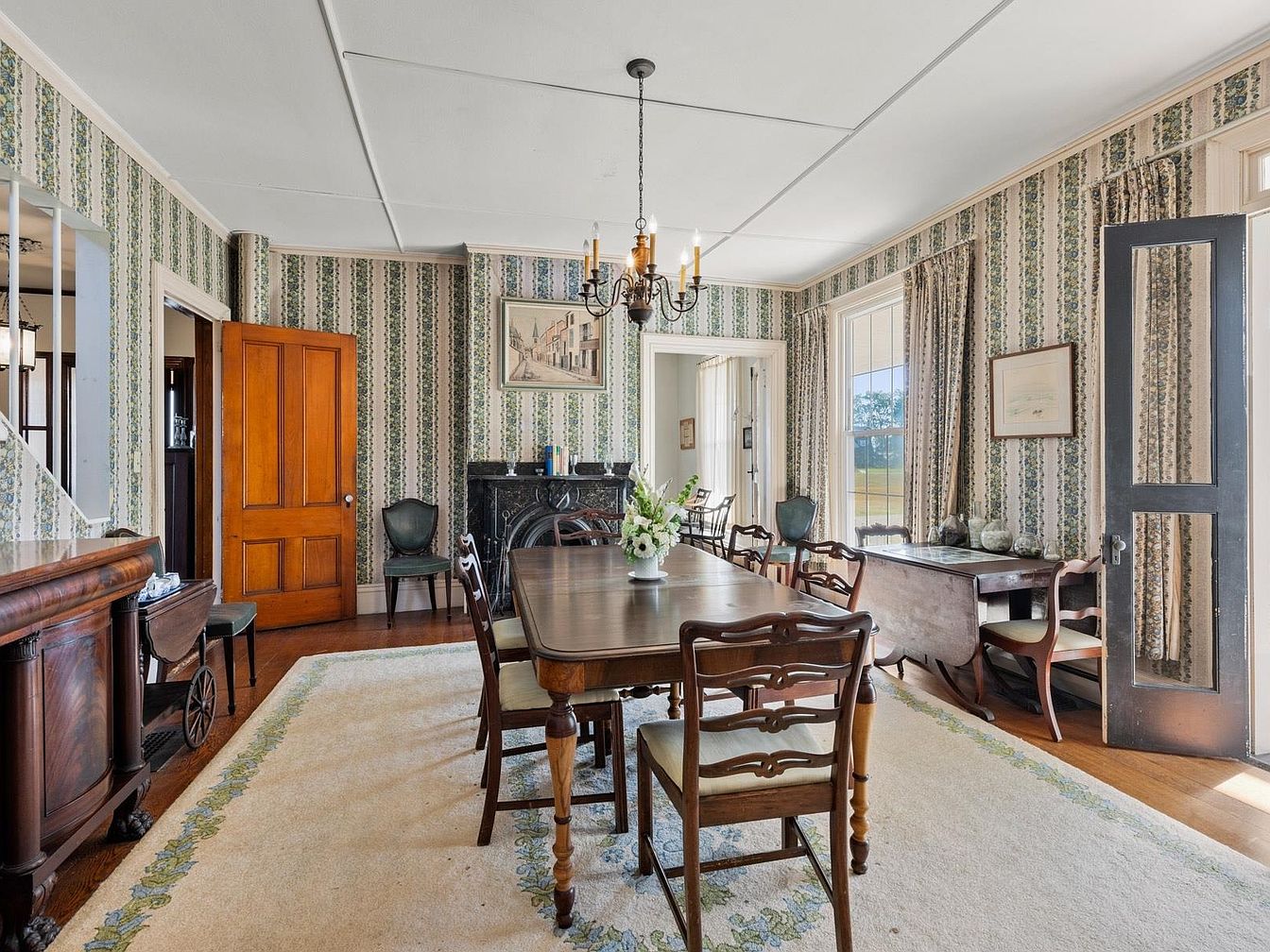 A spacious formal dining room features classic design elements with vintage charm. Elegant wood furnishings, including a large central dining table and ornate chairs, sit atop a soft, cream-colored rug bordered in green and blue. The room is warmed by rich wood doors and floors, accentuated by tall windows that flood the space with natural light. Family-focused details like ample seating and an inviting fireplace make it perfect for gatherings. Vertical floral wallpaper, tasteful artwork, and antique sideboards highlight the room’s period style while providing plenty of functional storage for family meals and celebrations.