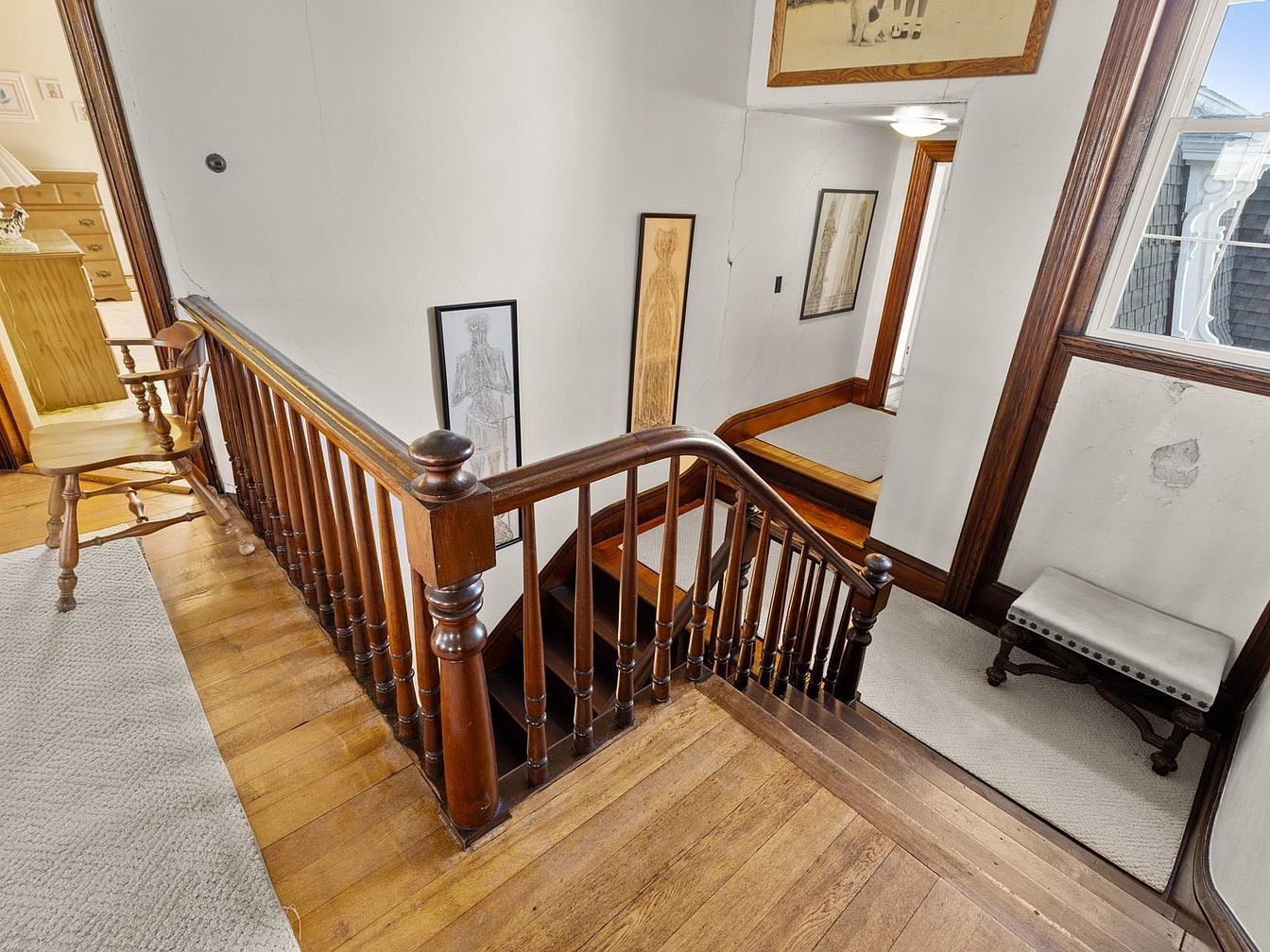 Warm wooden stair railings with classic turned spindles create a timeless look at this upper stairway landing. Natural light pours in from a large window, making the space feel bright and welcoming. The neutral wall color enhances the natural wood tones found in the flooring and trims, while simple framed art adds subtle character. A carved wooden chair sits near a doorway, paired with a cozy upholstered bench, offering practical seating options for family members. A carpet runner softens the transition from wood to carpeted hallway, making the space both inviting and safe for children and guests.
