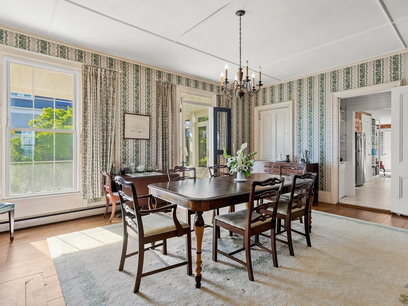 A spacious, sunlit dining room features large windows that allow natural light to flood the space, creating a warm and welcoming environment for family meals or gatherings. Elegant floral wallpaper, paired with matching curtains, lends vintage charm and continuity to the décor. The polished wood dining table seats six comfortably, surrounded by classic wooden chairs and anchored under a timeless area rug. A decorative chandelier provides ambient lighting, while tasteful sideboards and a writing desk offer additional function and storage. Access to the kitchen and outdoor areas ensures a convenient layout ideal for family living and entertaining.
