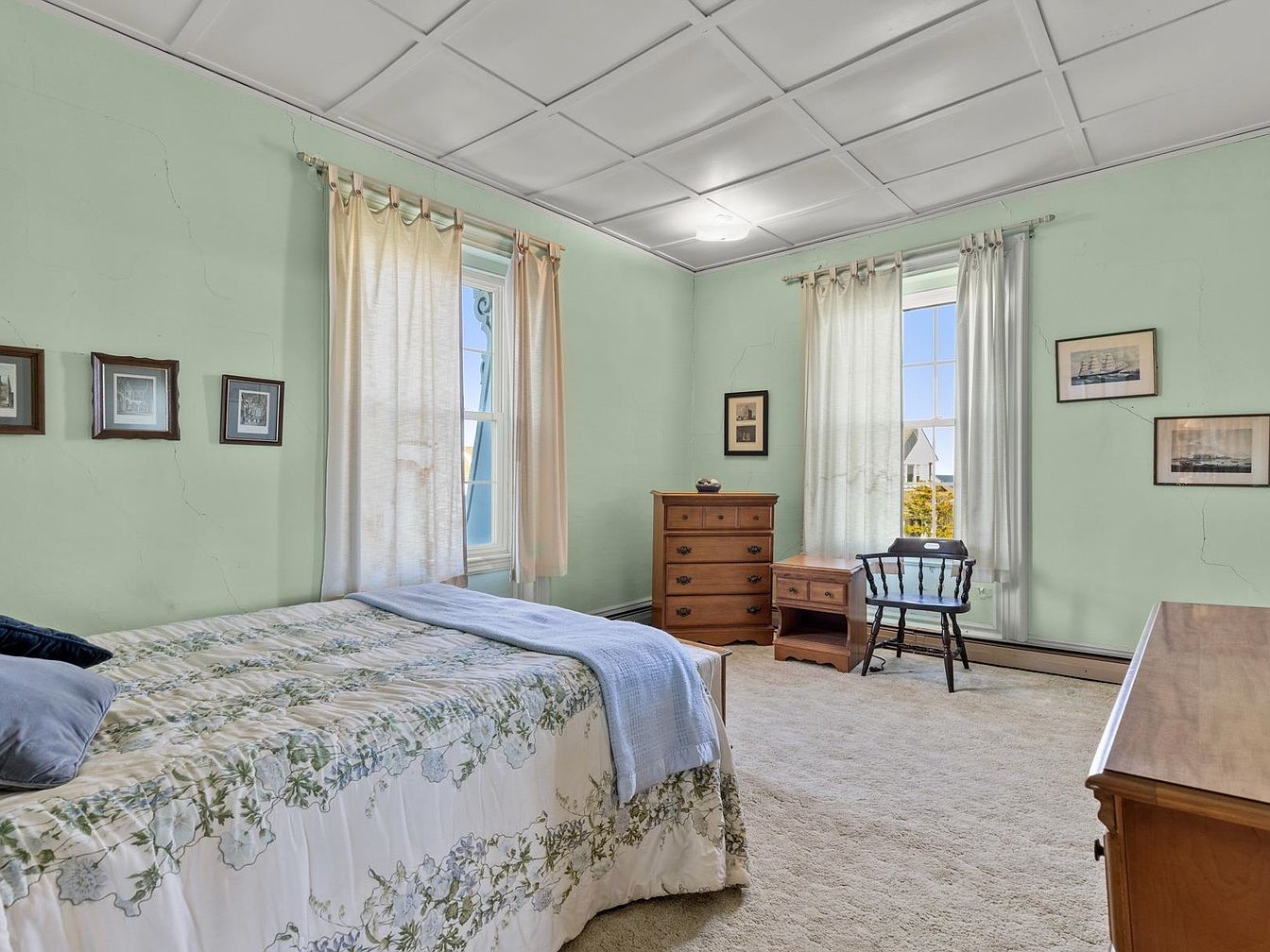 This inviting guest bedroom features soft mint green walls and an elegant coffered ceiling, creating a bright and airy atmosphere perfect for family stays or relaxation. Natural light streams through two large windows dressed in light, breezy curtains, illuminating the neutral plush carpet and classic wooden furniture. The space includes a floral-patterned bedspread, a spacious dresser, a nightstand, and a charming writing desk with a spindle-back chair. Framed artwork adds a personal touch, while the simple, open layout allows for easy movement—making it an ideal retreat for both adults and children. The overall design blends vintage charm with cozy comfort.