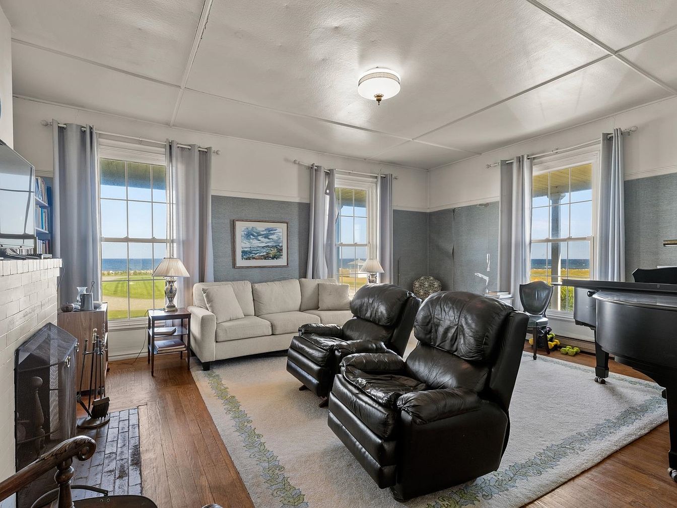 Spacious and inviting, this living room features expansive windows that flood the space with natural light and offer breathtaking views of the ocean and manicured lawn. The neutral color palette blends soft gray walls and trim with light curtains, creating a tranquil atmosphere. Plush, family-friendly furnishings include a large cream-colored sofa and two comfortable black leather recliners perfect for relaxing or movie nights. A white brick fireplace adds charm and warmth, while a grand piano hints at musical evenings. Thoughtfully arranged tables with lamps ensure ample lighting for reading or conversation, making this an ideal setting for family gatherings and unwinding together.