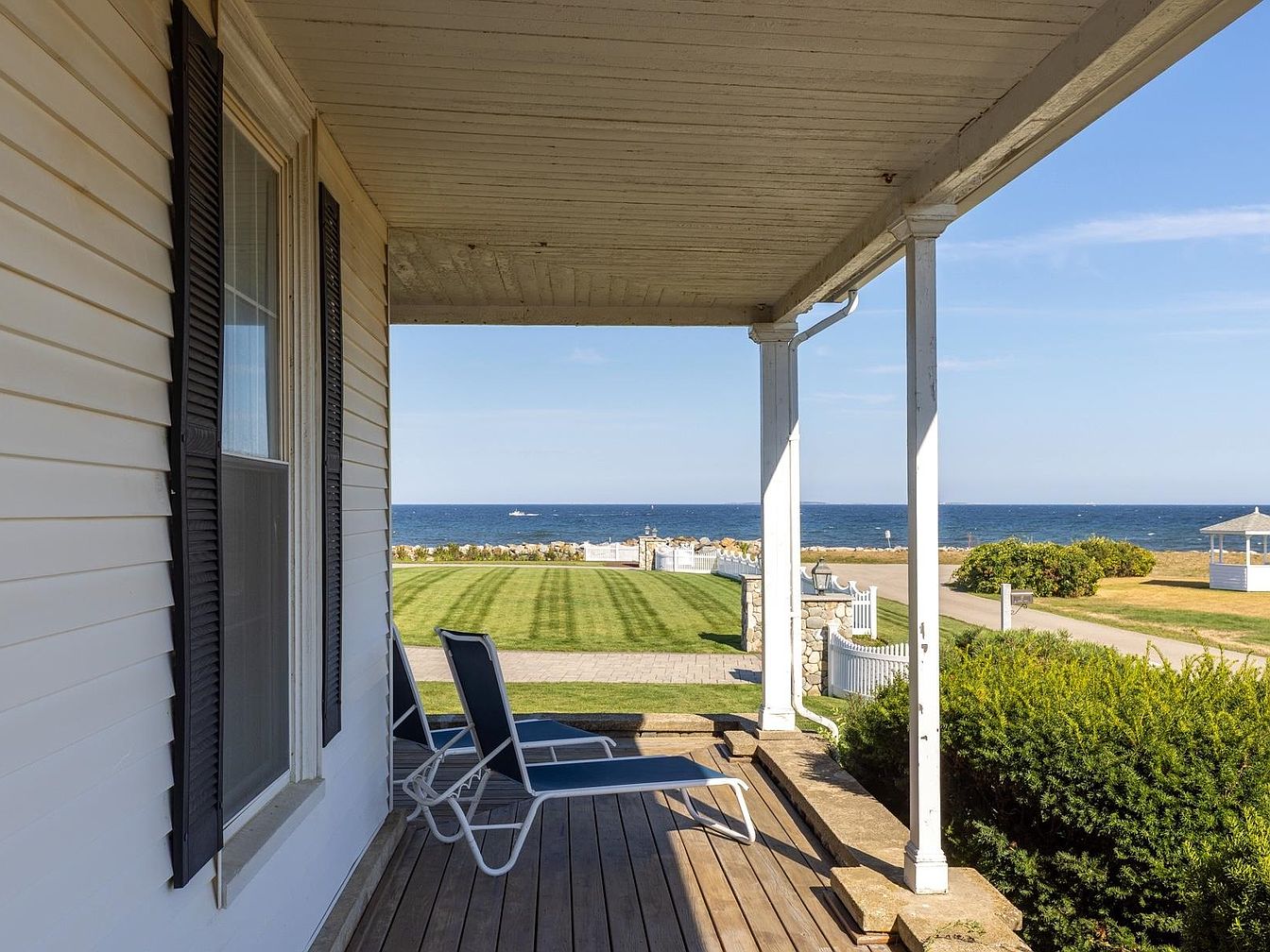 A charming covered porch provides an inviting transition from the home to lush, manicured lawns stretching out toward the ocean. Clean white siding with black window shutters lends classic American coastal style, while two simple lounge chairs encourage relaxation with family or friends. The open wooden decking is spacious enough for gathering, making it easy to supervise children playing on the expansive grass below. Crisp white fencing and sturdy columns frame the view, creating a sense of safety and privacy. The tranquil seascape and gentle breeze complete the welcoming and peaceful atmosphere, perfect for family memories by the water.
