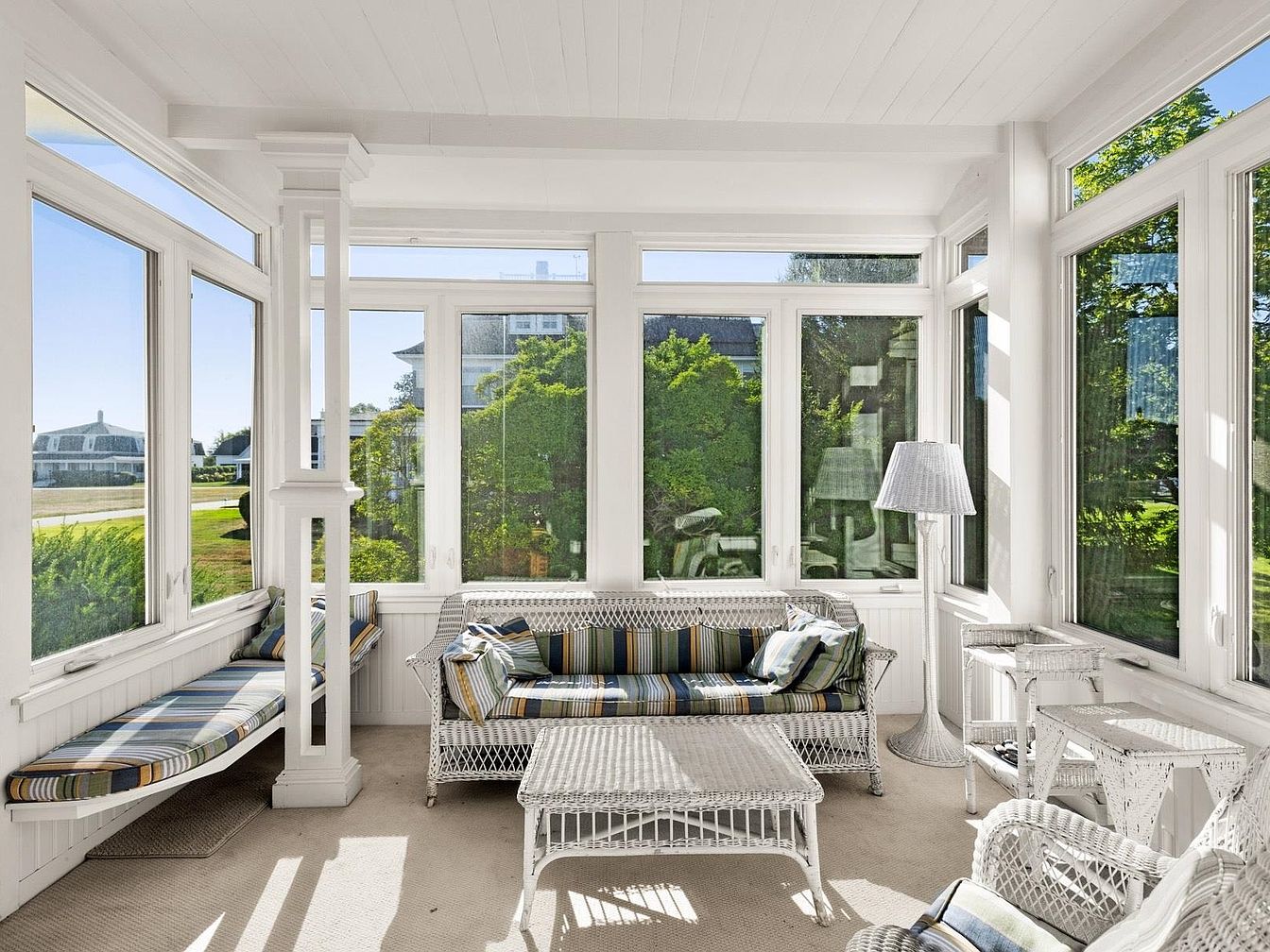 An inviting sunroom filled with natural light streams through floor-to-ceiling windows, offering panoramic views of the lush outdoors. The space features crisp white walls, beadboard paneling, and a cathedral ceiling, enhancing the bright and airy ambiance. Comfortable white wicker furniture with striped, colorful cushions provides cozy seating for the whole family, while a built-in window bench adds a charming spot for children to relax. Carpeted flooring creates a soft, warm feel underfoot, perfect for barefoot play or reading. This family-friendly retreat is ideal for indoor-outdoor living, leisurely afternoons, and enjoying scenic views year-round in stylish comfort.