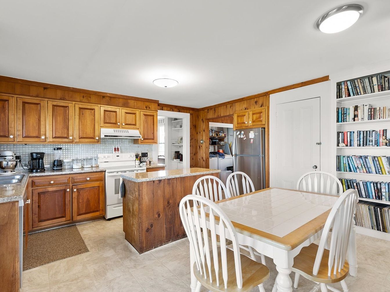 Warm wood cabinetry and paneled walls create an inviting, rustic charm in this combined kitchen and dining space. Granite countertops and a central island maximize workspace, making it ideal for family cooking and gatherings. A dining table with white, spindle-back chairs sits nearby, encouraging shared meals and conversation. Built-in bookshelves offer a playful, intellectual touch, practical for storing recipes or children’s books. Natural light enhances the neutral tiled flooring, while the open layout connects seamlessly to adjacent rooms. Stainless steel appliances and subtle white tile backsplash bring a cozy, contemporary appeal suitable for families seeking functionality and style.