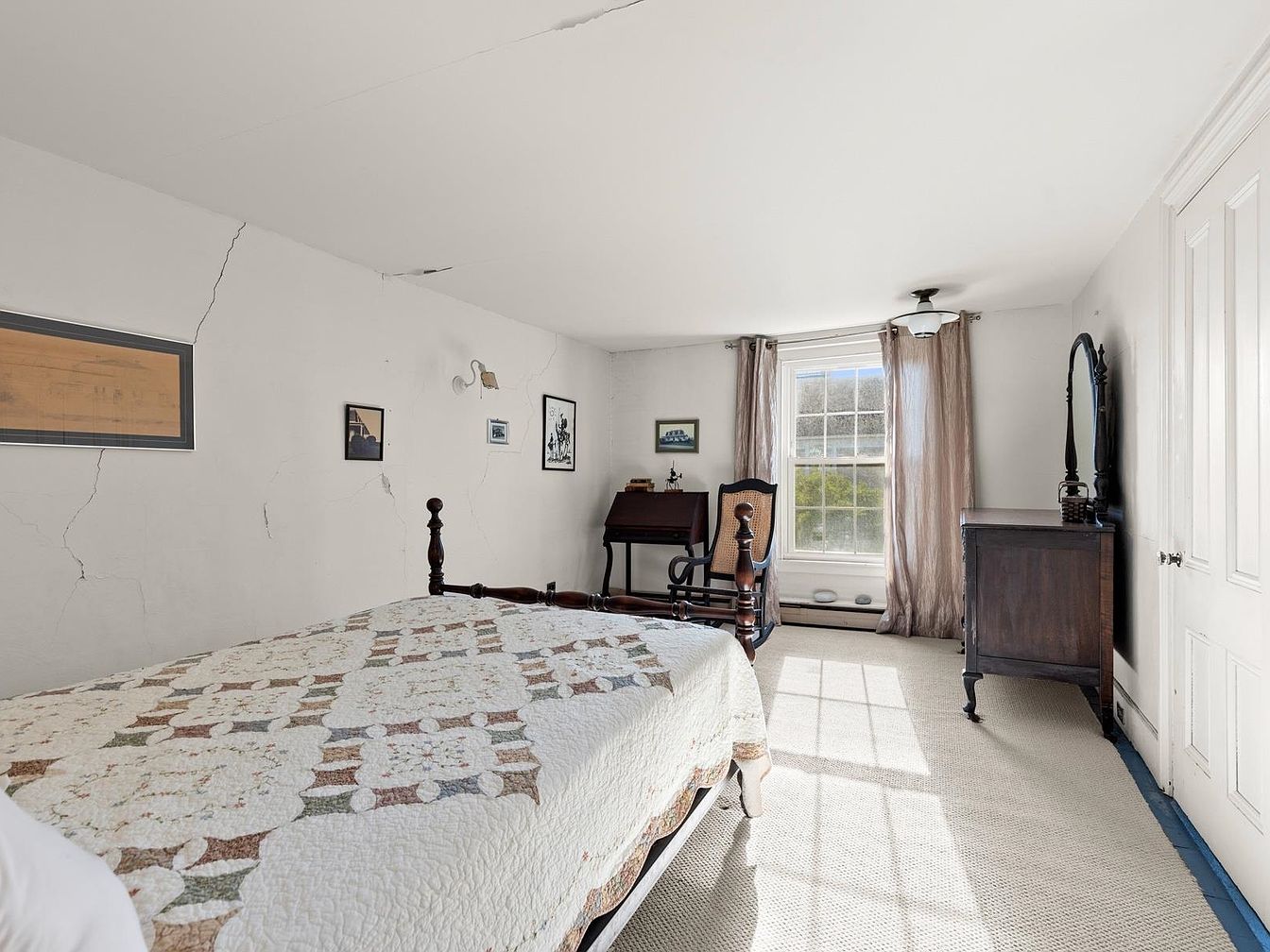 Bathed in natural light from a large window, this bedroom exudes a sense of tranquility and tradition. A vintage wooden bed with a detailed quilted bedspread serves as the centerpiece, while the soft, neutral palette of whites and creams creates a calm atmosphere. Family-friendly touches include a plush carpet, making the space inviting and comfortable for all ages. Antique-style furniture, including a writing desk, a rocking chair, and a classic dresser with a mirror, add character. Subtle wall art and gently draped curtains complete the timeless, cozy aesthetic that encourages relaxation and family togetherness.