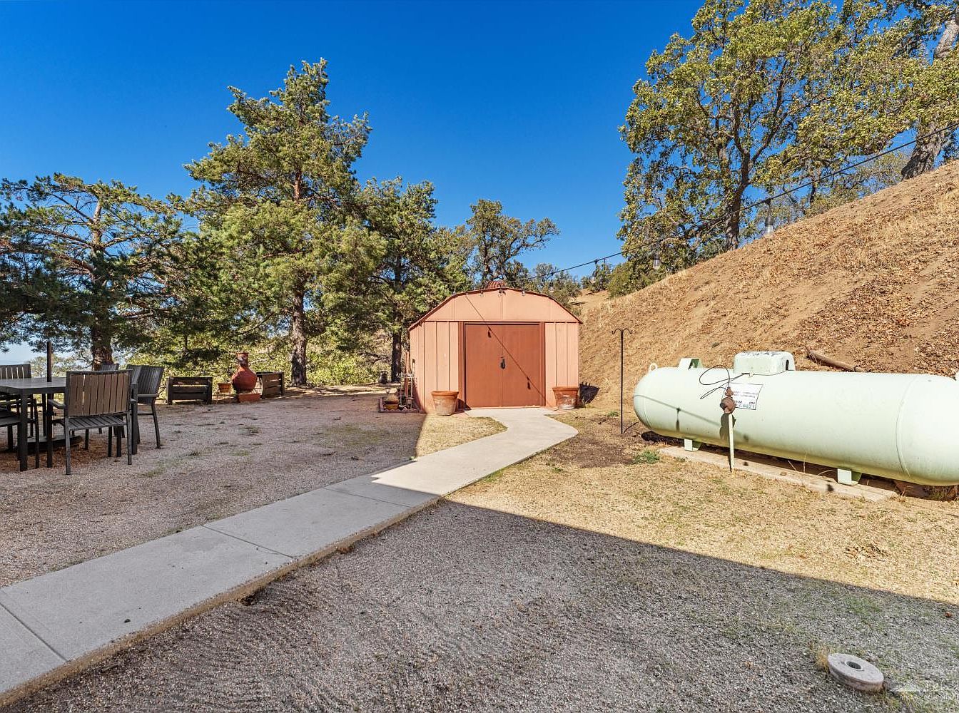 This backyard space features a practical and inviting layout for outdoor living and utility. A central concrete path leads directly to a cheerful red shed, ideal for storage or hobbies, while ample open area is provided for gatherings. The outdoor dining table with sturdy chairs makes it easy to host family meals or barbecues, complemented by relaxing seating around a fire pit for cooler evenings. Mature trees offer natural shade and privacy, enhancing the peaceful ambiance. Earth tones in the shed and landscape blend with the surroundings, and a visible propane tank hints at practical amenities for a family-friendly, functional yard.