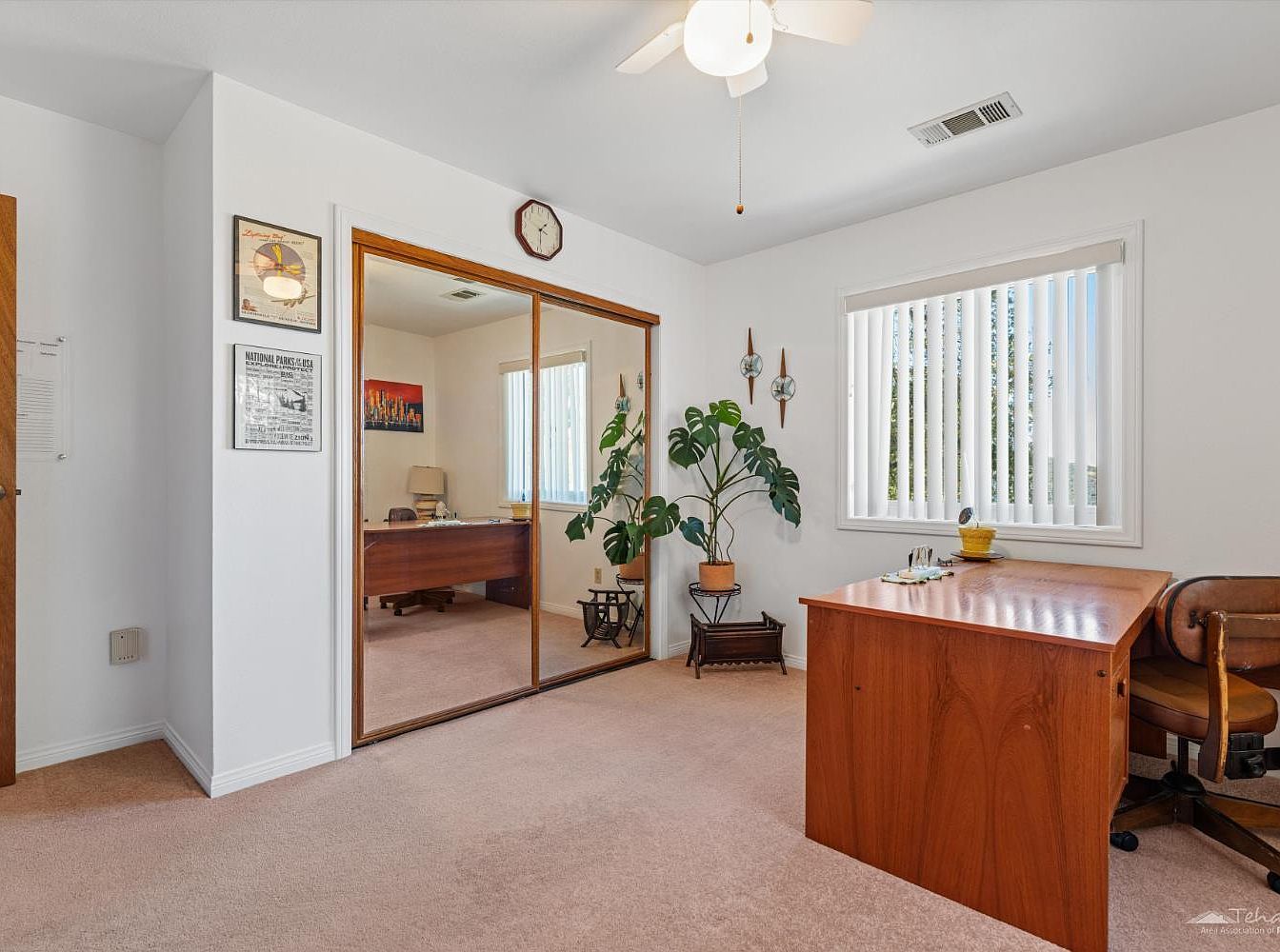 This spacious home office is designed for productivity and comfort, featuring a wall of mirrored closets that visually expand the room and maximize storage. The neutral palette of light carpeting and white walls offers a calming foundation, while wood furnishings bring warmth and a classic touch. Large windows fitted with vertical blinds flood the area with natural light, making it family-friendly for supervised study sessions or shared projects. Touches of greenery add a refreshing accent, and personal décor on the walls creates an inviting, lived-in feel. Ample workspace and ergonomic seating make this area ideal for work or homework.