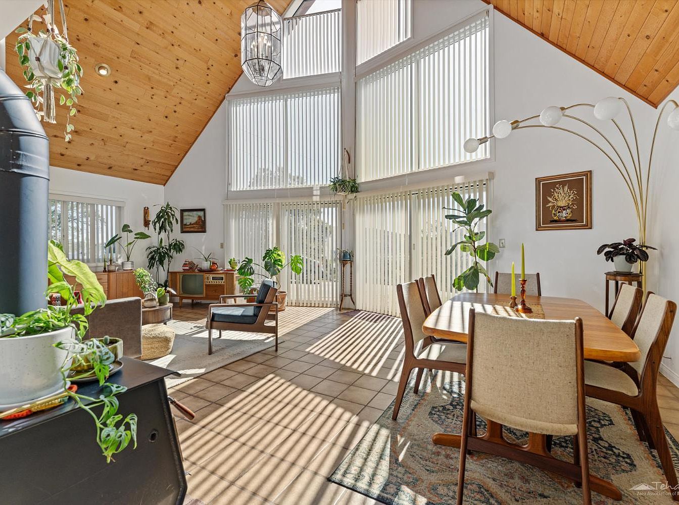 Soaring vaulted ceilings lined with warm wood planks create an inviting atmosphere in this open-concept living and dining area. Full-height windows fill the room with natural light while vertical blinds offer privacy as needed. The contemporary dining table is surrounded by mid-century modern chairs on a subtle, patterned rug, perfect for family gatherings. A cozy wood stove anchors the living area, which features plush seating and an array of thriving green plants. Clean lines, neutral tones, and natural textures blend seamlessly, while thoughtful details like the vintage console and striking arc lamp add sophisticated charm, making the space both stylish and family-friendly.