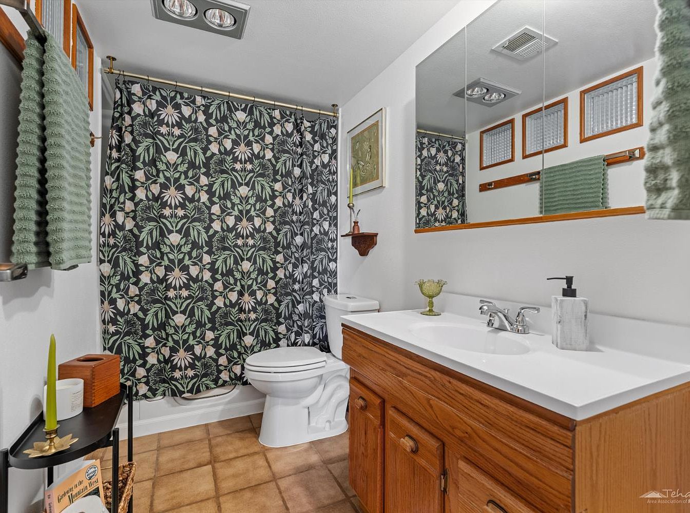 A welcoming, family-friendly bathroom balances functionality with warm, homey aesthetics. The wooden vanity offers generous counter space and storage, complemented by a large mirrored cabinet for additional organization. Earthy ceramic floor tiles add a touch of rustic charm, while the floral shower curtain introduces a lively yet soothing botanical motif. Soft green towels and simple decorative accents enhance the inviting, cohesive look. Practical touches such as accessible shelving and sturdy fixtures make daily routines easy for all ages. High glass windows bring in natural light, ensuring the space feels bright and comfortable throughout the day.