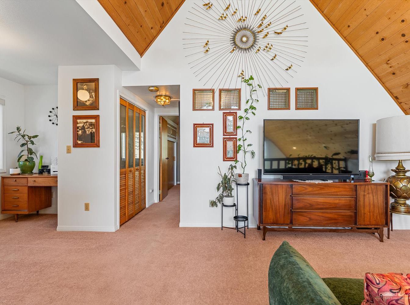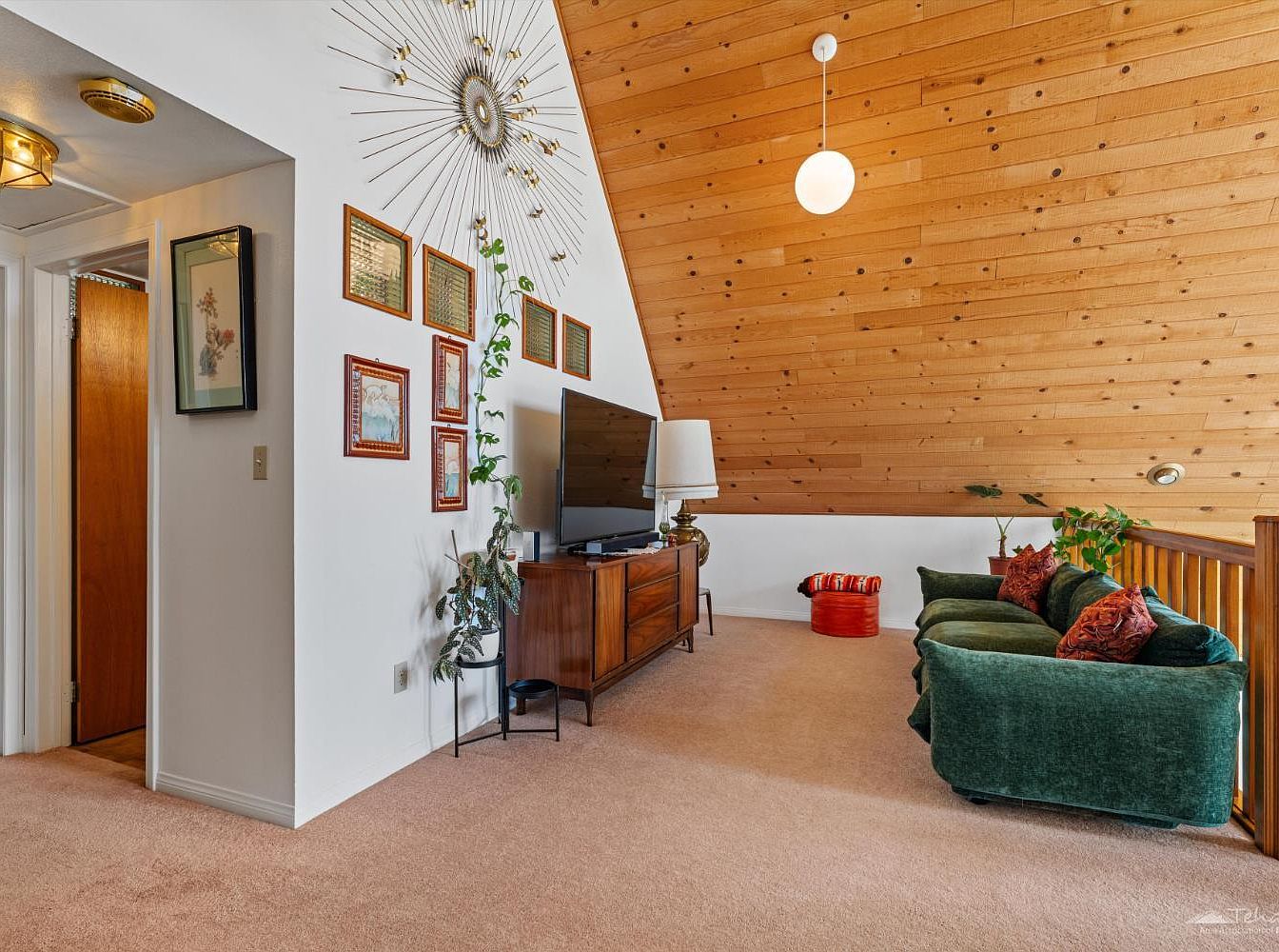 This inviting living room blends mid-century modern style with cozy family living. Warm wood-paneled ceilings contrast beautifully with crisp white walls, and a plush, neutral carpet ties the space together. The focal point is a stylish wooden media console beneath a large TV, complemented by eclectic wall art, mirrors, and a dramatic sunburst sculpture. An array of framed photographs, hanging plants, and decorative accents add a personal touch. A vaulted ceiling enhances the openness, while generous natural light and a green velvet sofa create a welcoming atmosphere, ideal for relaxing with family or entertaining guests.