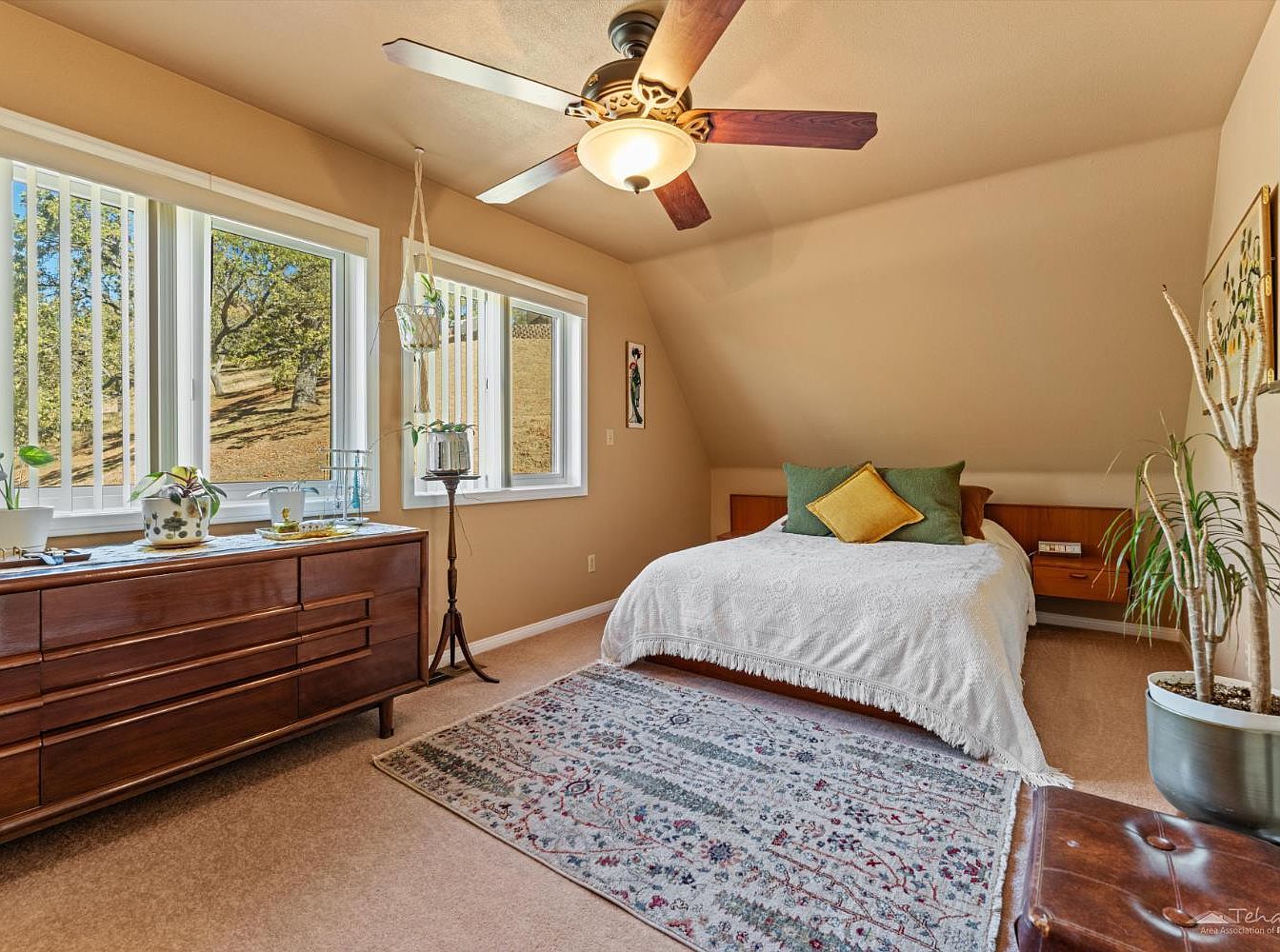 Warm, earthy tones define this inviting bedroom with soft beige walls and plush carpeting underfoot. Natural light floods through three vertical windows, offering a scenic view of mature trees just outside. A mid-century modern dresser along one wall provides ample storage while displaying fresh plants and artful accents, creating a cheerful, cultivated vibe. The bed is adorned with a textured white coverlet and green and gold accent pillows, backed by a simple wooden headboard. Family-friendly features include durable finishes, open floor space for play, and easy-to-clean surfaces, making this room as practical as it is comforting and serene.