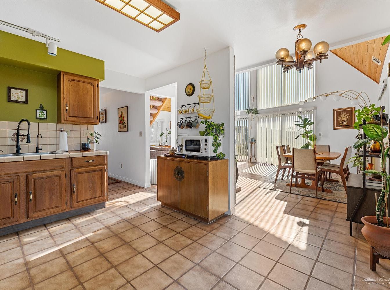 Warm terracotta-tiled floors connect the kitchen and dining areas, creating an inviting and cohesive open layout. The kitchen showcases classic wooden cabinetry with a mid-century flair, complemented by an olive-green accent wall for added character. Natural light pours in from towering windows in the dining space, illuminating the cheerful, plant-filled environment. Family-friendly details include a practical peninsula workspace, visible storage for everyday essentials, and a sturdy round dining table with comfortable chairs for gatherings. Golden light fixtures and retro decorative touches accentuate the room’s welcoming vibe, perfect for both meal prep and family moments.