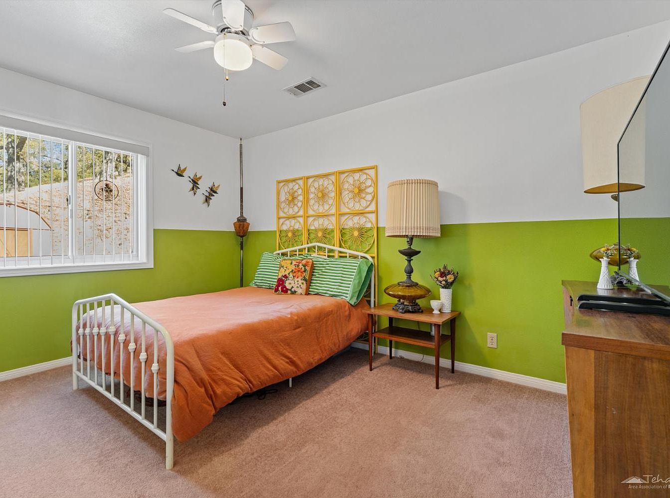 A bright and cheerful bedroom features a playful green and white two-tone wall, complemented by a cozy peach bedspread and striped accent pillows. Natural light pours in through a large window with secure bars, giving the space a safe and airy feel for families. Eclectic and vintage touches shine in the ornate gold headboard art, retro lamp, and mid-century side table. Wall-mounted bird art and a whimsical centerpiece add charm. Plush carpeting underfoot creates a warm, inviting atmosphere, while a ceiling fan ensures comfort. The arrangement is practical and uncluttered, appealing to both children and adults.