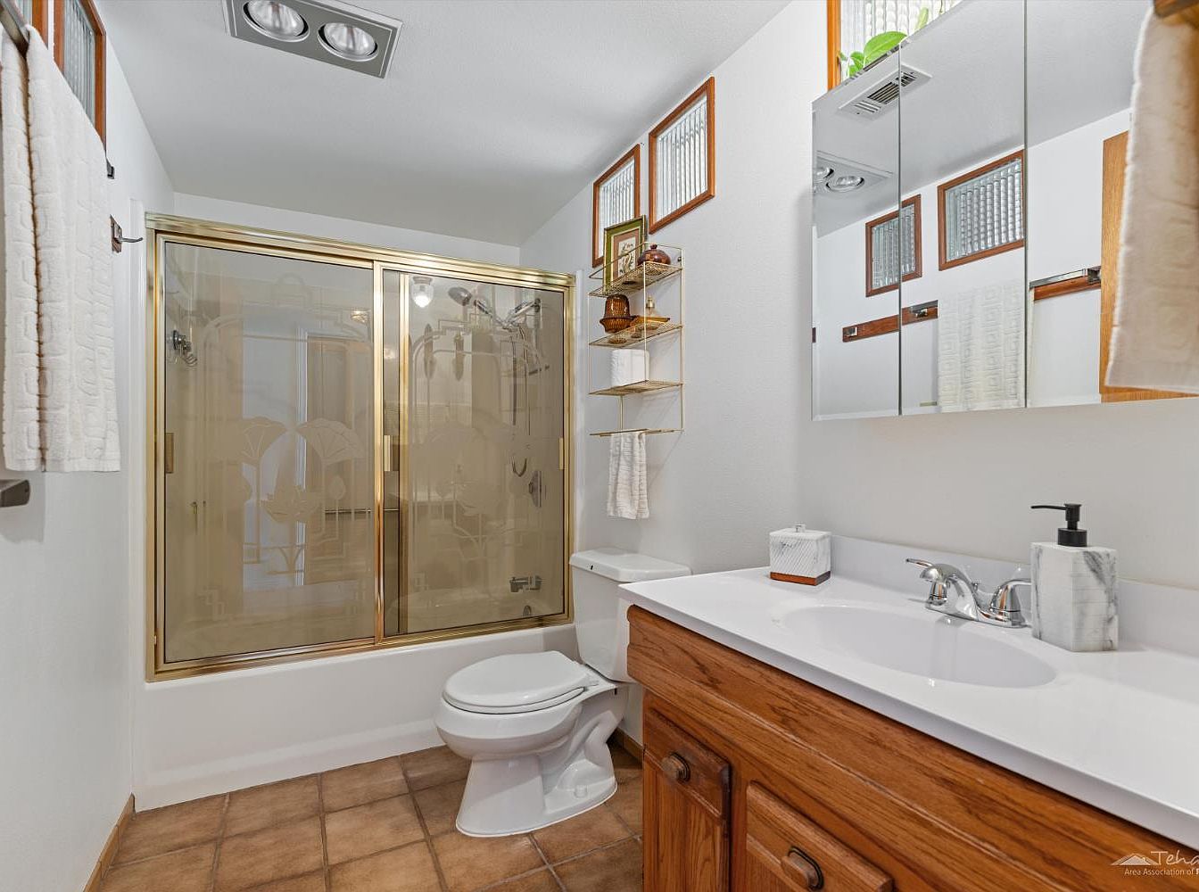 A spacious bathroom featuring a double-door glass shower with a gold frame and subtly etched design offers both elegance and privacy. The room is anchored by warm terracotta tile flooring and a rich wood vanity with clean white countertop and modern fixtures. Above the sink, mirrored cabinets provide ample storage, while natural light filters through high, patterned glass windows with wood trim, creating an uplifting, airy atmosphere. Thoughtful shelving near the toilet keeps essentials organized and accessible. Soft neutral walls and plush towels make this a practical, family-friendly space, combining comfort and easy maintenance with timeless style.
