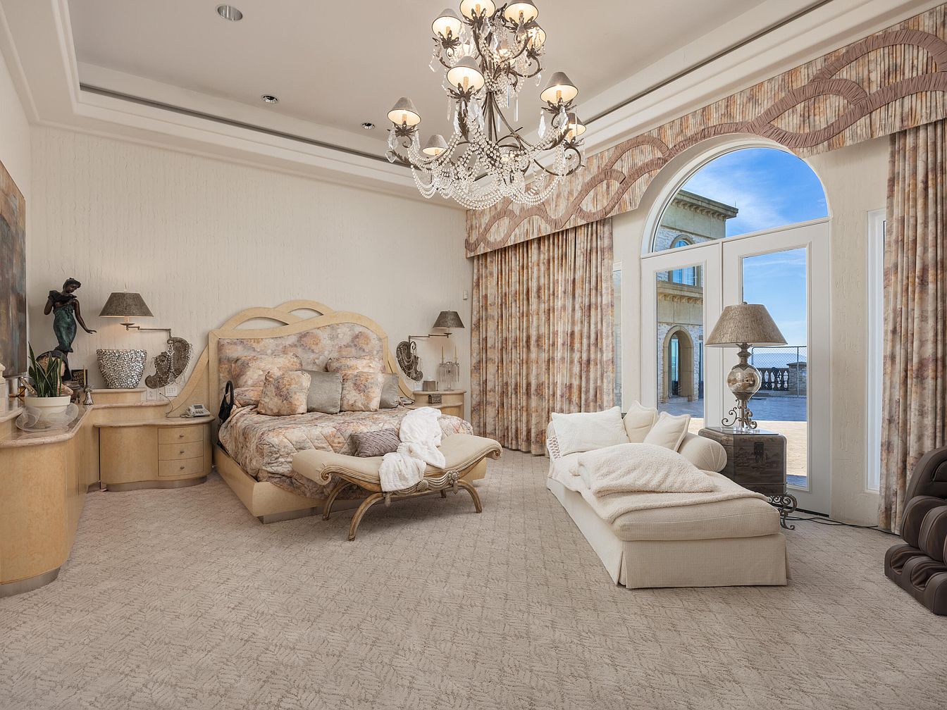 A serene and spacious master bedroom features a large plush bed with matching floral-patterned bedding and pillows, flanked by elegant built-in nightstands and unique metallic lamps. Oversized windows with decorative drapes and a sweeping arched transom flood the area with natural light, while providing stunning views of the outdoor veranda and water beyond. A comfortable chaise lounge invites relaxation, perfect for quiet moments or family story time. Warm neutral tones dominate the palette, accented by soft carpet and gentle curves throughout the furniture. Artistic touches and a grand chandelier blend luxury with a welcoming, family-friendly atmosphere.