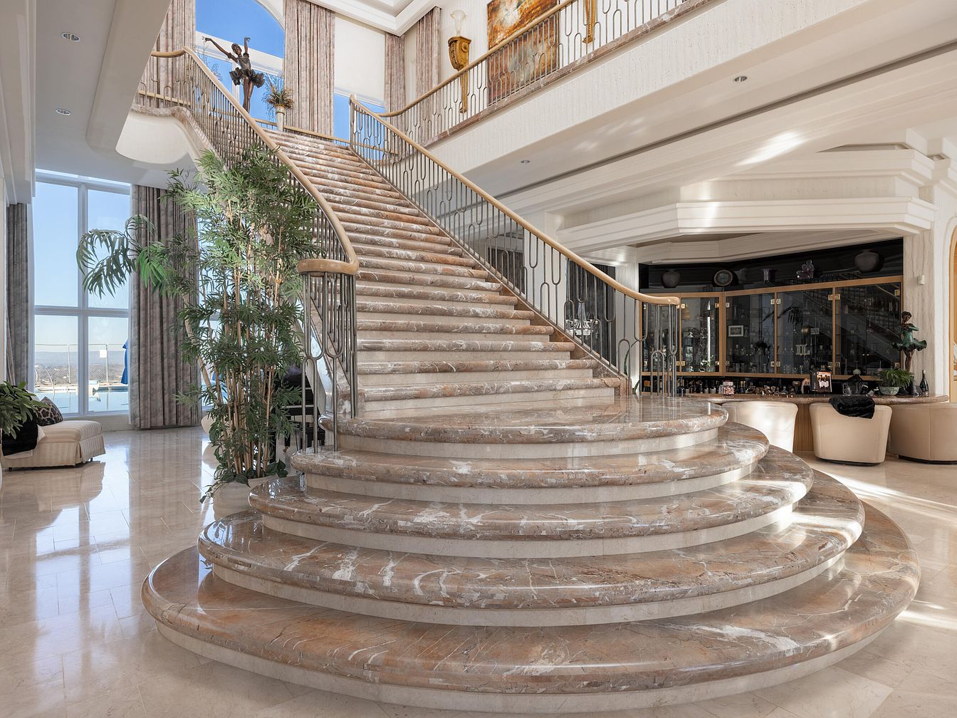 An impressive foyer features a sweeping, curved staircase crafted from polished marble, offering a luxurious first impression. The open-plan layout is accentuated by double-height ceilings and floor-to-ceiling windows that flood the space with natural light. Neutral tones of cream, beige, and tan provide a classic backdrop, complemented by plush upholstered seating and strategically placed greenery, creating a welcoming environment for families and guests. Metal railings with elegant detailing add allure, while curated artwork and family photographs contribute a personal touch. This grand entryway is designed for both style and function, providing ample space for gatherings and comfortable accessibility.