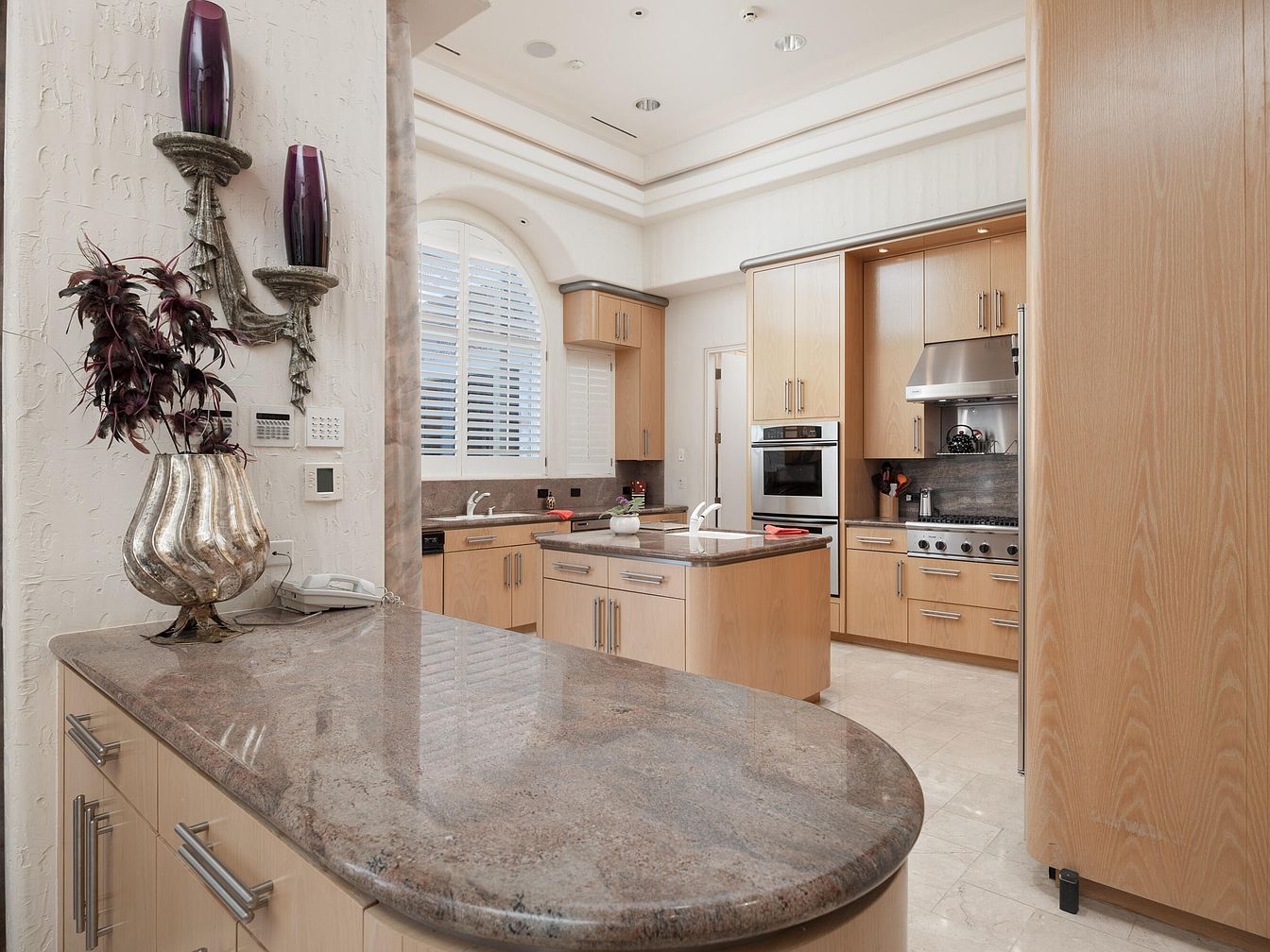 This spacious kitchen highlights light wood cabinetry paired with sleek granite countertops, creating a warm and inviting environment for family gatherings and daily routines. The open layout features a large central island that serves as a perfect spot for meal prep or casual breakfasts, while built-in appliances including a double oven and professional-grade range offer both style and functionality. An arched window with plantation shutters brings in natural light, enhancing the bright and airy ambiance. Modern hardware and stainless steel accents blend seamlessly with the neutral tones, ensuring an elegant yet practical space suited for busy family life.