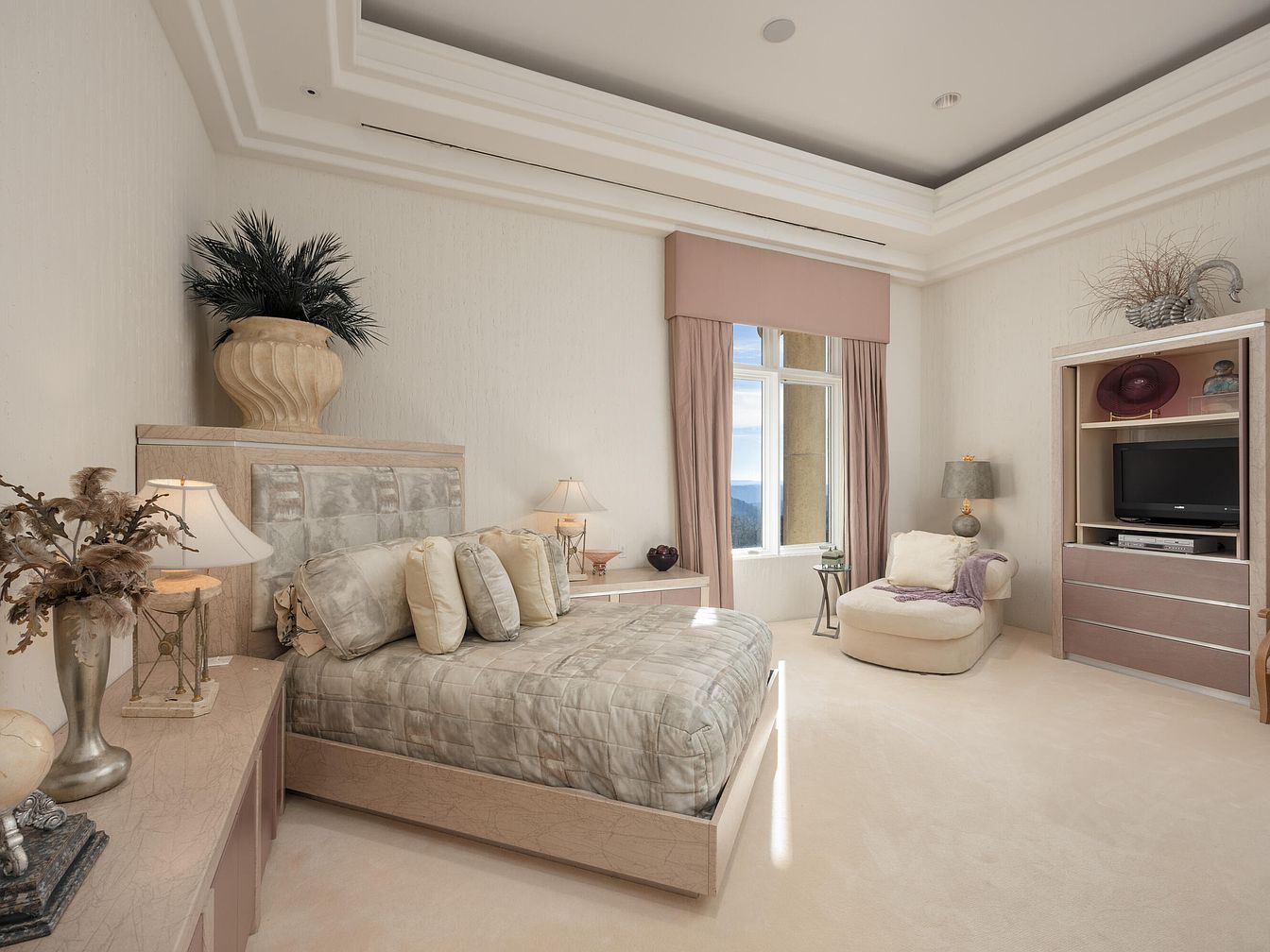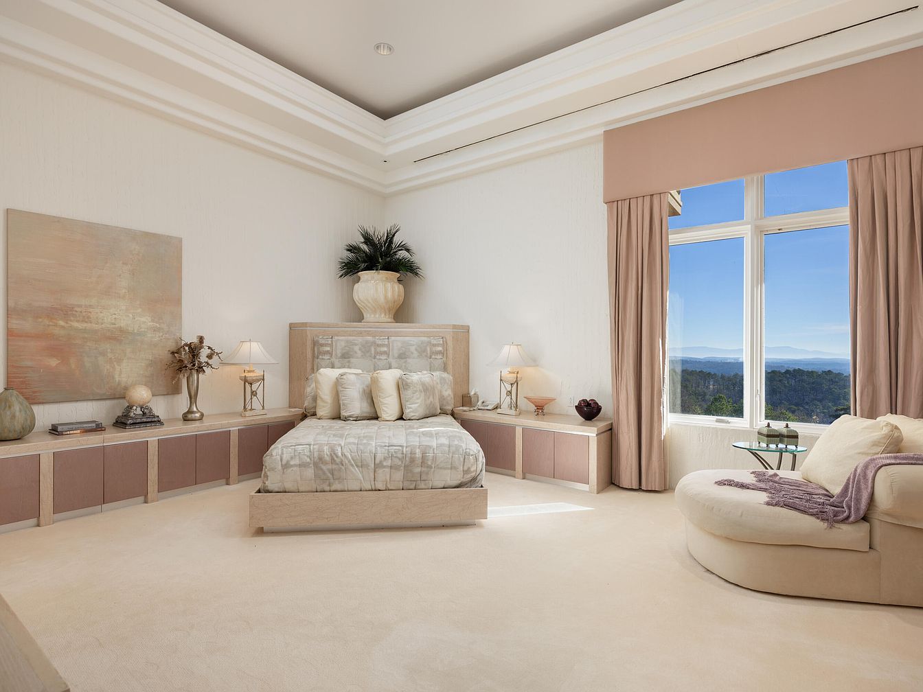 A serene master bedroom highlighted by a soothing palette of creams, blushes, and neutral earth tones. The spacious layout includes a plush central bed with coordinating pillows, flanked by elegant built-in cabinetry perfect for storage or display. Large windows allow abundant natural light and sweeping views, creating a calming atmosphere ideal for relaxing or spending time with loved ones. An inviting chaise lounge and glass-topped side table enhance comfort, making the space both functional and family-friendly. Stylish wall art, soft textured carpeting, and gentle lighting complete an ambiance of understated luxury and everyday comfort.