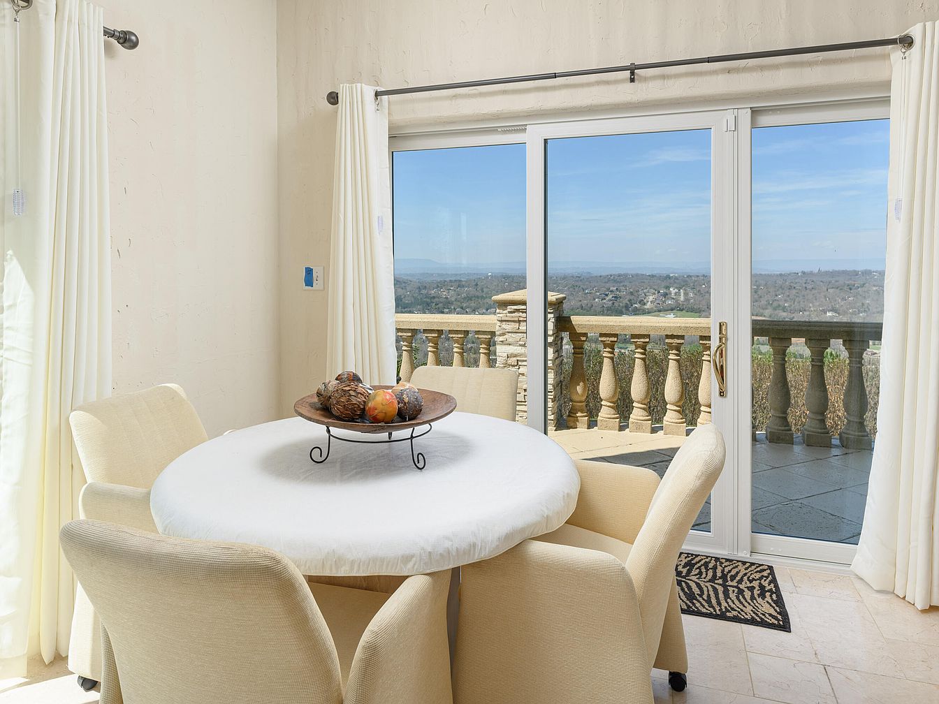 A cozy breakfast nook bathed in natural light offers a serene ambiance with its large glass doors leading onto an outdoor terrace. Plush, cream-colored upholstered chairs surround a round table topped with a simple decorative centerpiece, ideal for casual family meals or morning coffee. The neutral palette of soft whites and beiges creates a warm, inviting space, making it perfect for families with children. Light, textured walls and flowing curtains complement the room’s airy feel, while the sliding doors not only fill the space with sunshine but also reveal breathtaking panoramic views, blurring the line between indoor comfort and outdoor beauty.