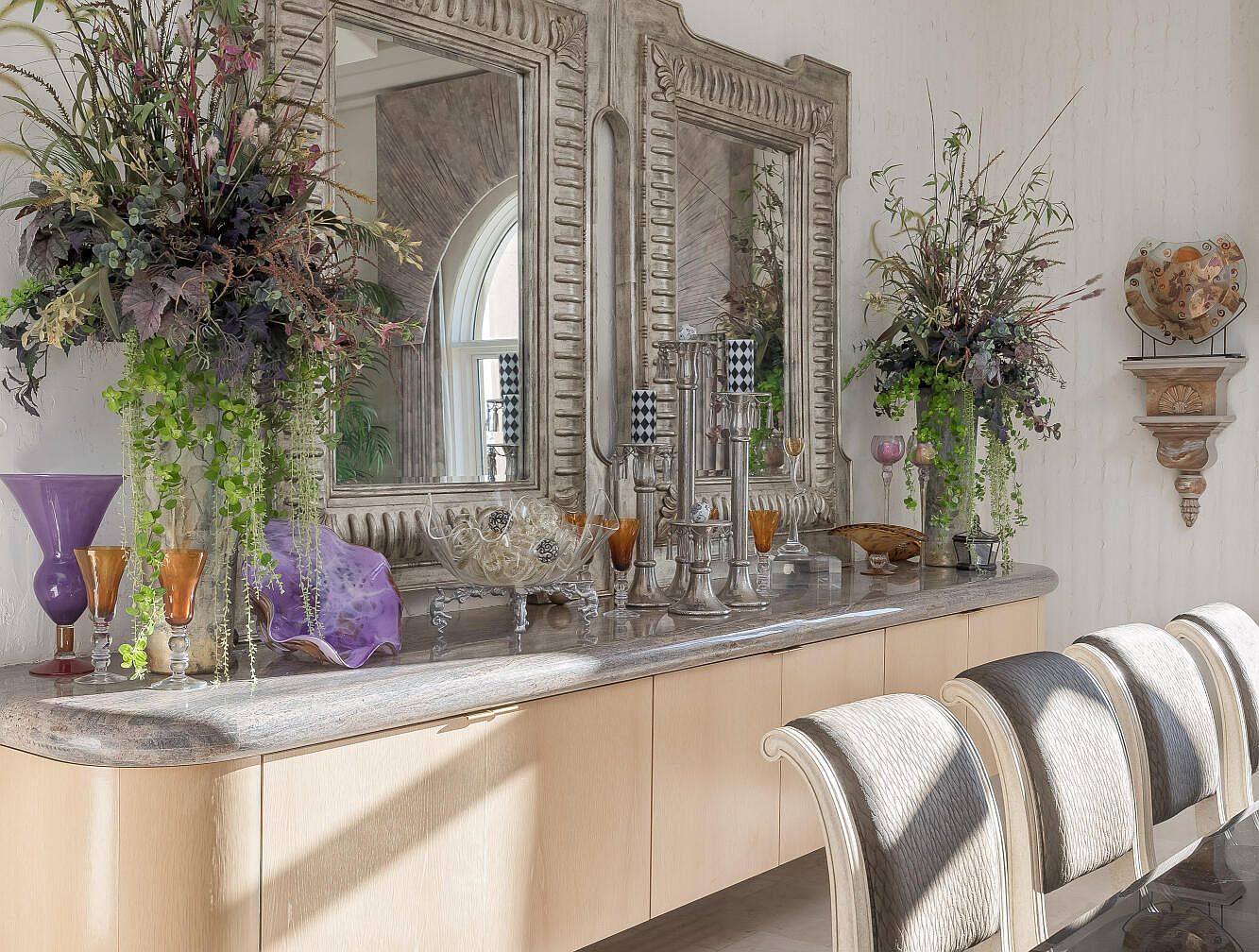 A spacious dining room buffet area features a striking combination of classic elegance and modern comfort. The long, stone-topped sideboard is framed by oversized decorative mirrors that reflect natural light, giving the space an airy feel. Ornate silver candlesticks, amethyst glassware, and artistic bowls add refined character, while two lush floral arrangements bring life and fresh color. Sculpted, upholstered dining chairs with curved backs invite family gatherings, and their neutral tones complement the light wood cabinetry. The palette balances gentle greys and soft purples for a sophisticated, family-friendly ambiance perfect for shared meals and celebrations.