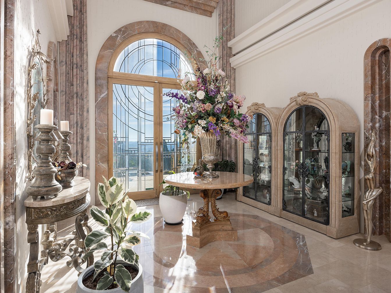 A grand entryway welcomes guests with soaring ceilings, an abundance of natural light streaming through an arched glass door, and polished marble floors that enhance the spaciousness. A striking round table adorned with a lavish floral arrangement serves as the centerpiece. Matching marble and gold display cabinets elegantly showcase curated collectibles, while a classic console table holds ornate candle holders. Warm, creamy hues and touches of gold create a timeless color palette, and thoughtful placement of houseplants adds a touch of freshness. The wide, open layout allows for easy family access and effortless movement, making visitors feel immediately at home.